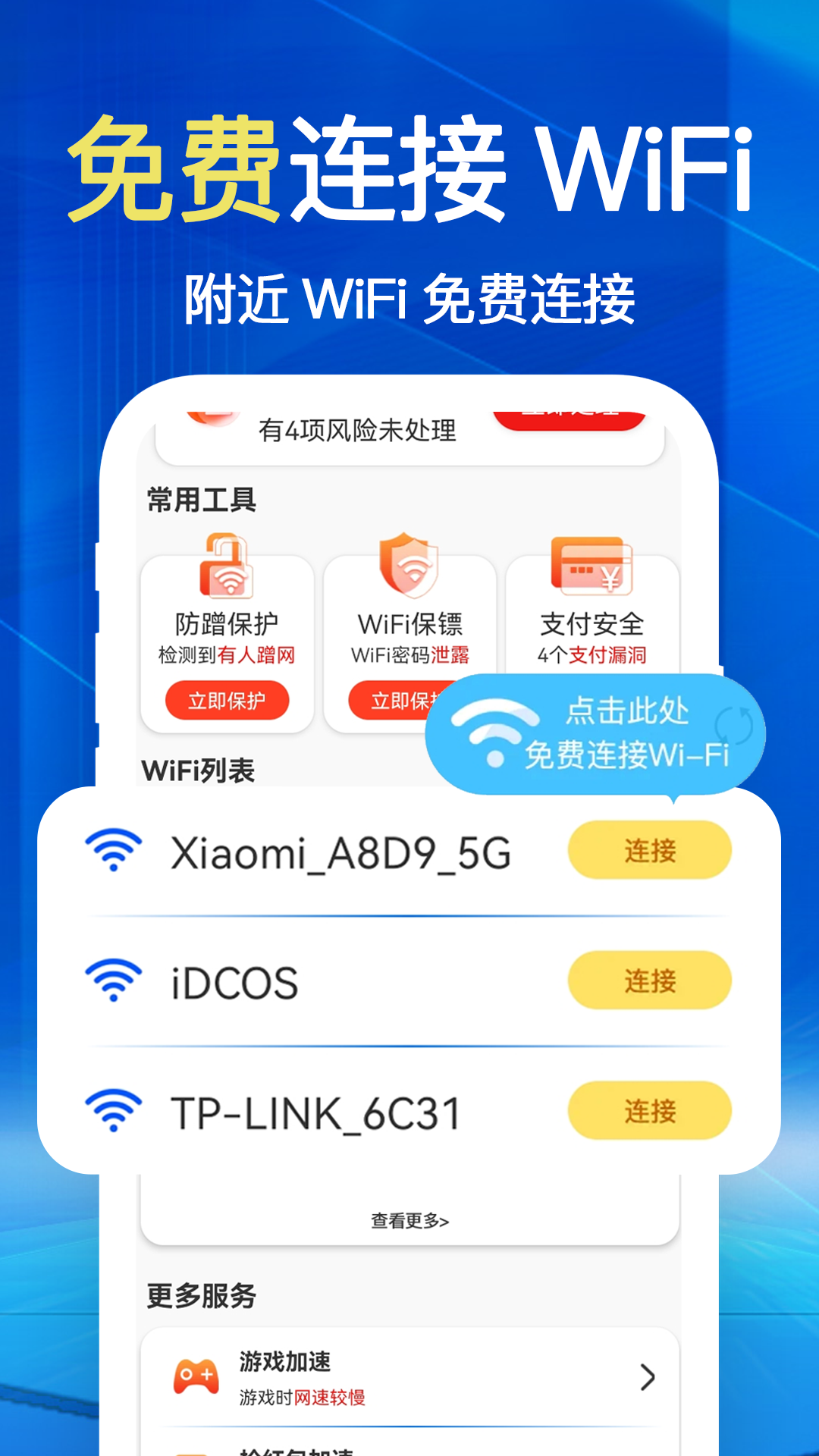 5.免费连接WiFi:快速搜索并接入周边热点,无需繁琐密码,即刻享受流畅网络。