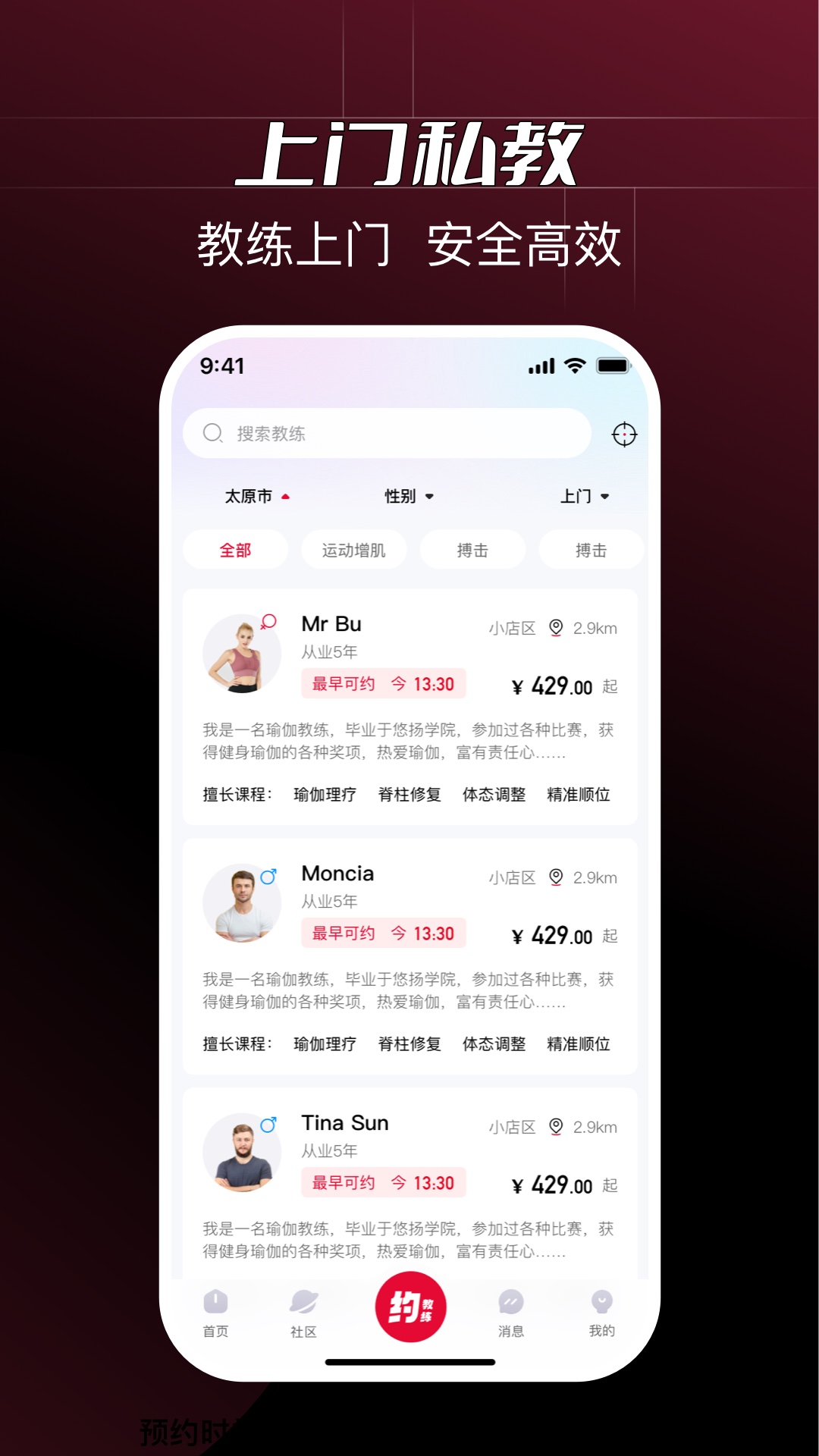 - 上门私教:您可以挑选自己中意的私教课程直接下单,单次消费即可随时开始训练,训练全程有录音保障安全,课后还会有私教提供针对性的专业数据总结。