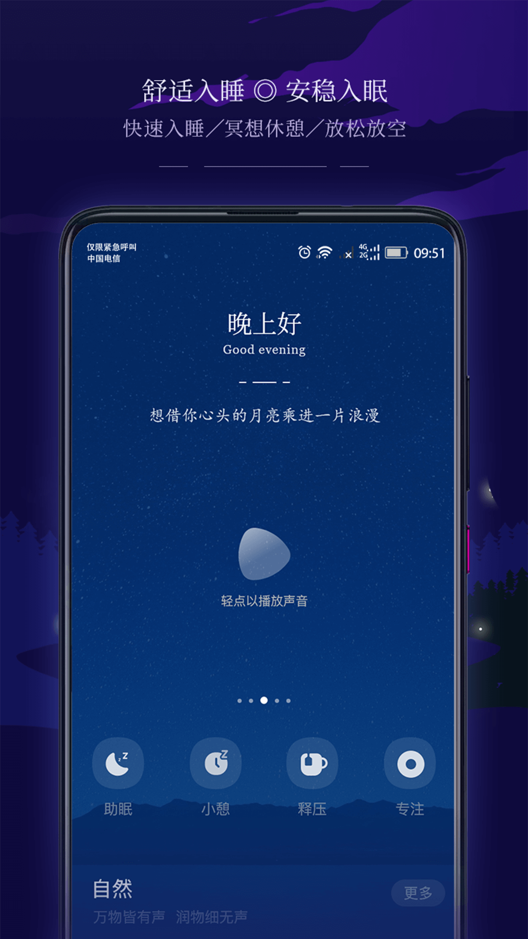 拥有海量的音乐储备,这些音乐都是针对睡眠、专注、冥想等不同场景特别打造的,同时还收集了自然白噪音,无论您处于何种场景,都能满足您的不同需求。