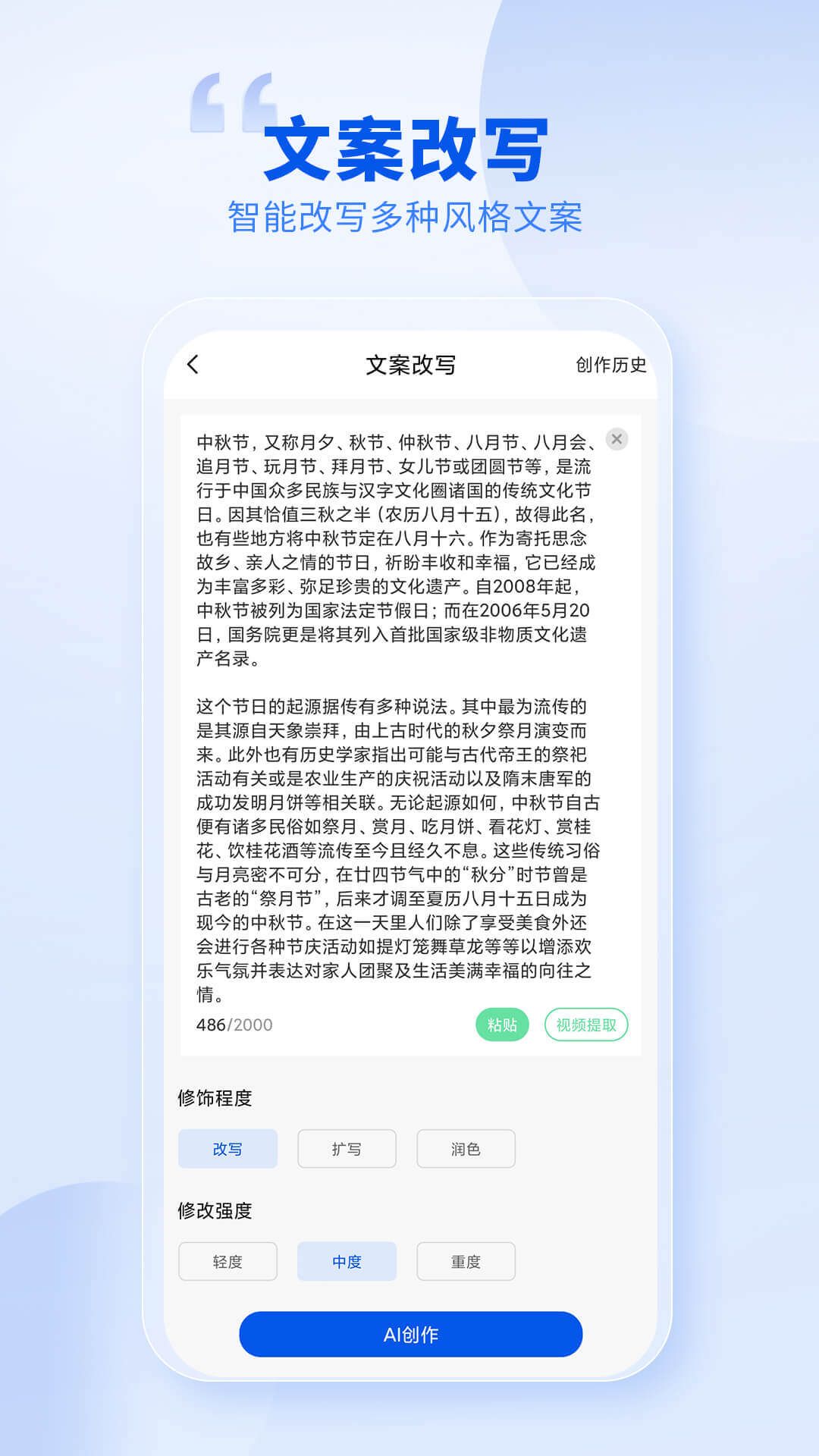- **文案改写功能**:可以对文本文案进行AI智能化的改写、扩写和润色,使内容表达更加完善。