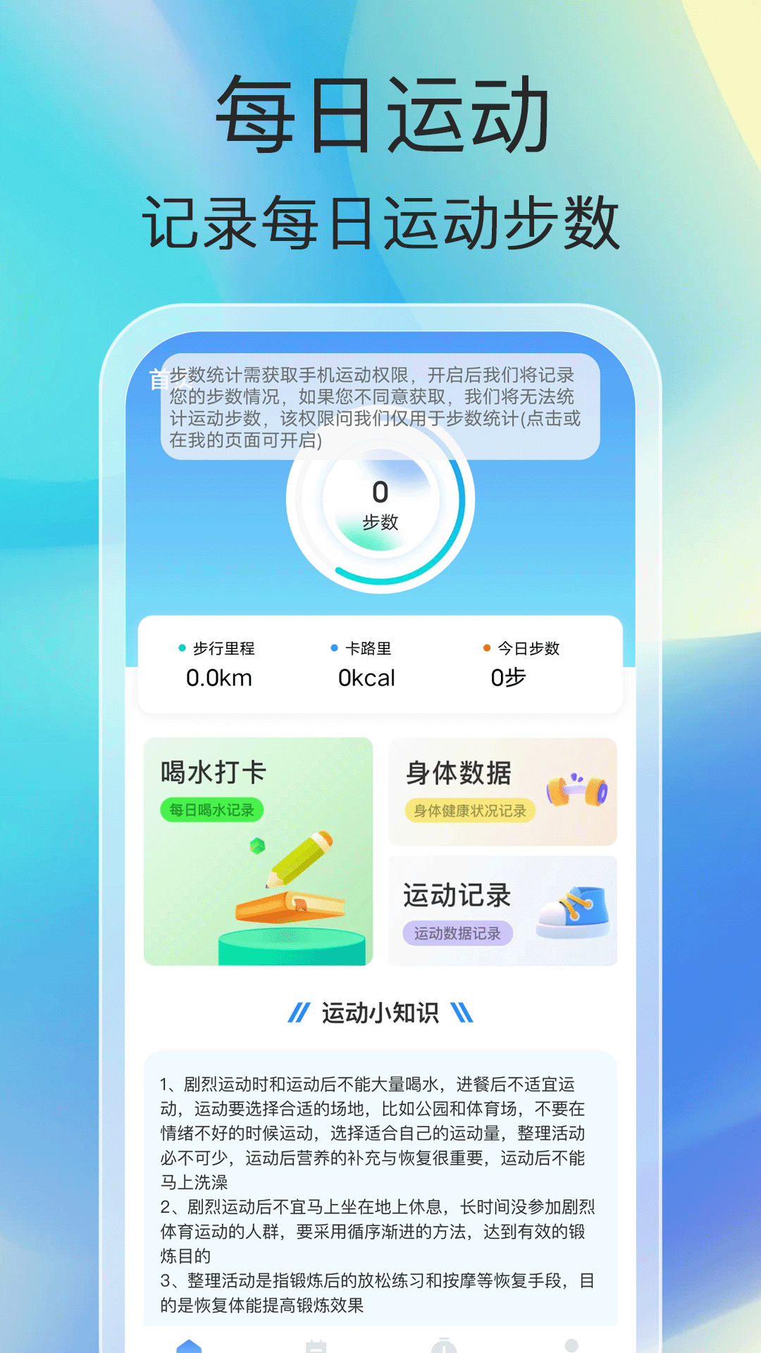 [首页] 帮助用户记录运动步数里程、消耗卡路里和今日的步数。还为用户提供喝水打卡、身体数据记录和运动记录,帮助用户养成良好的运动习惯。下方还为用户提供了更加科学的运动小知识。
