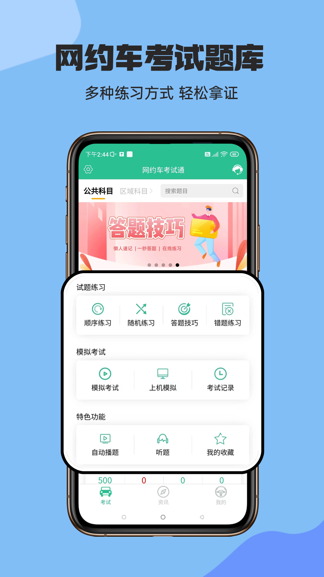 它会实时同步更新许多城市新增加的网约车考试题库,并且提供答案解析、答题技巧,还能进行网约车在线学习考试,真可谓是网约车考试一点通!