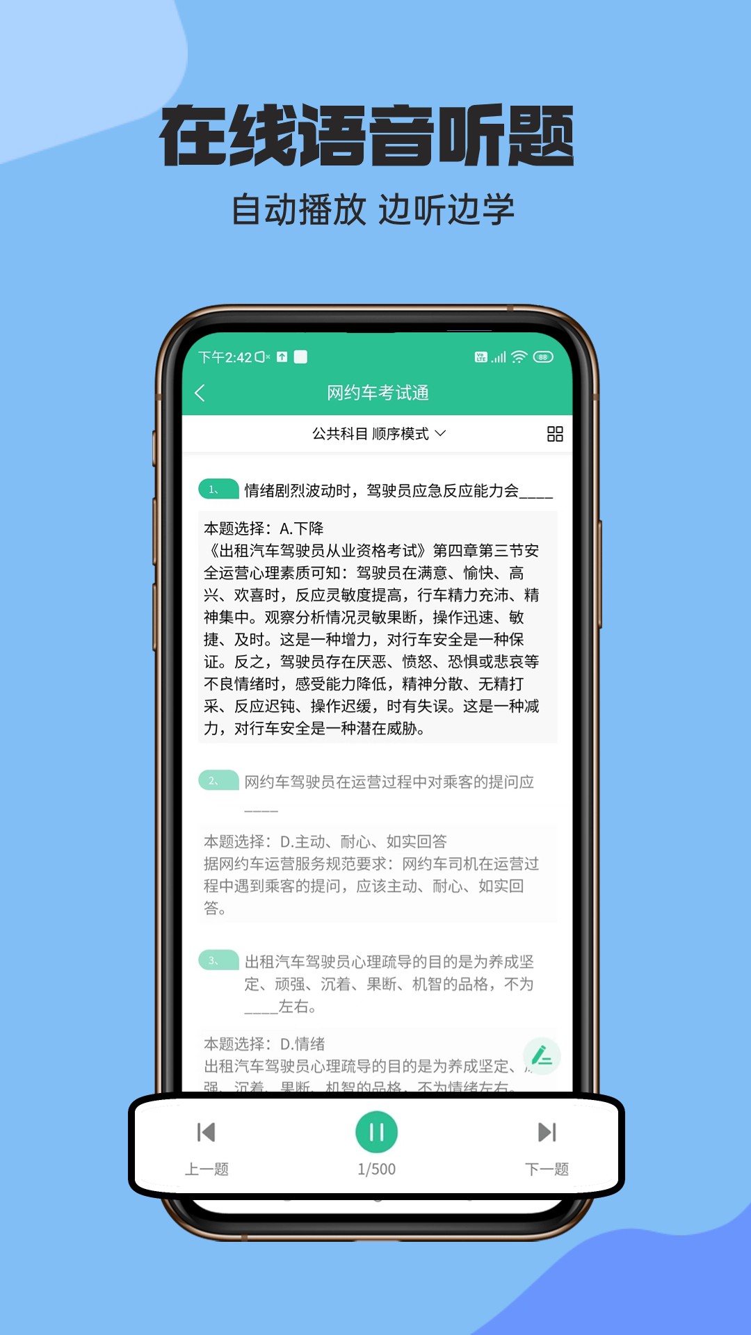 【语音听题】可以自动播题,实现语音听题,这样在开车的时候也能学习,利用碎片化时间就能轻松掌握考点。