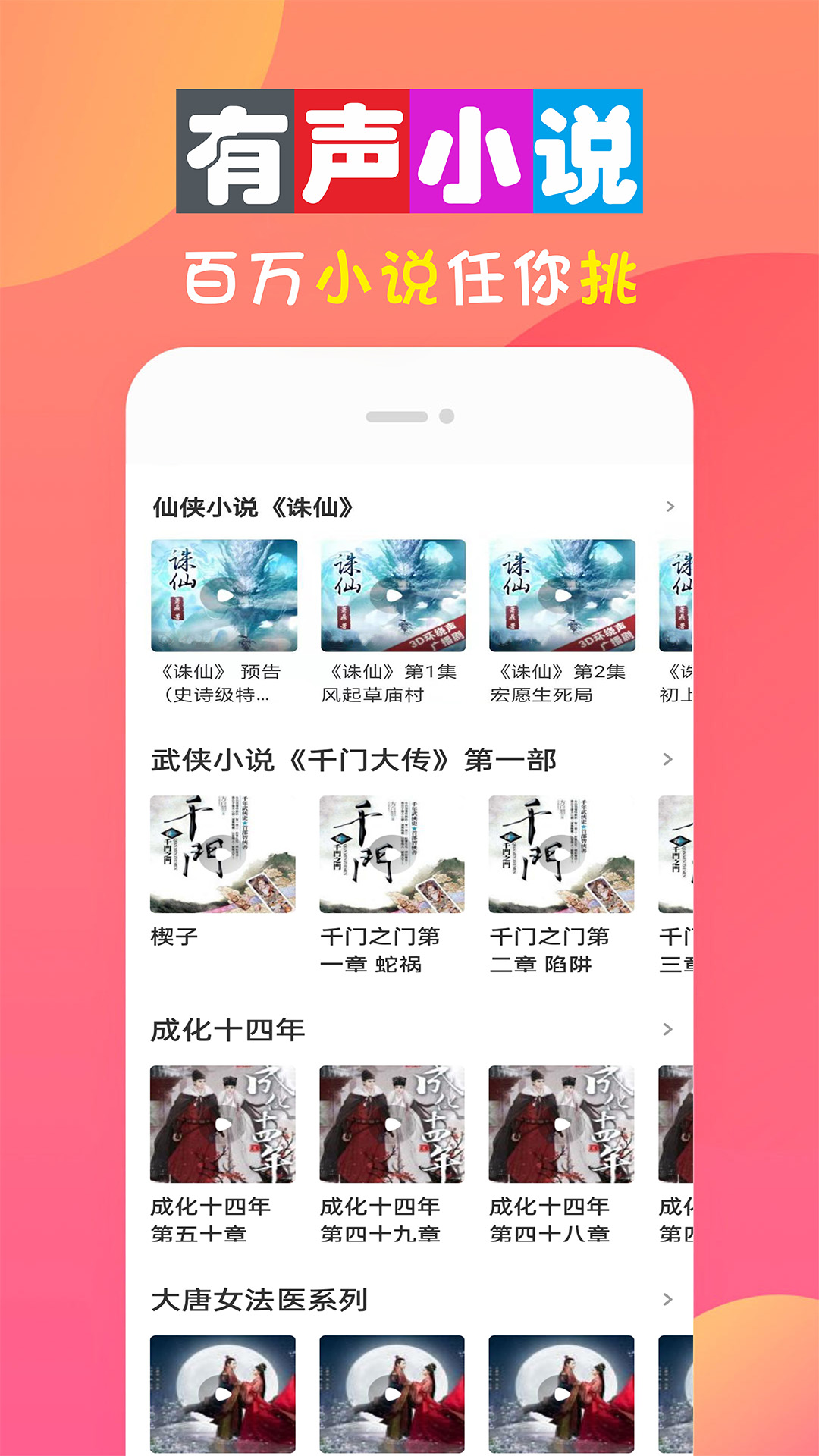 上万部各类题材小说实时更新,每月保持7000小时新鲜有声听书内容更新;汇聚了当下热门芈月传奇、左耳、余罪、欢乐颂、盗墓笔记、鬼吹灯等热门小说、全本小说、网络小说、畅销文学、追更连载为一体的小说听书平台!以及单田方评书大全、易中天品三国、蕊希电台、郭德纲经典相声、袁腾飞经典合集丰富的有声资源,带您体验热门、优质经典的免费听书魅力!
