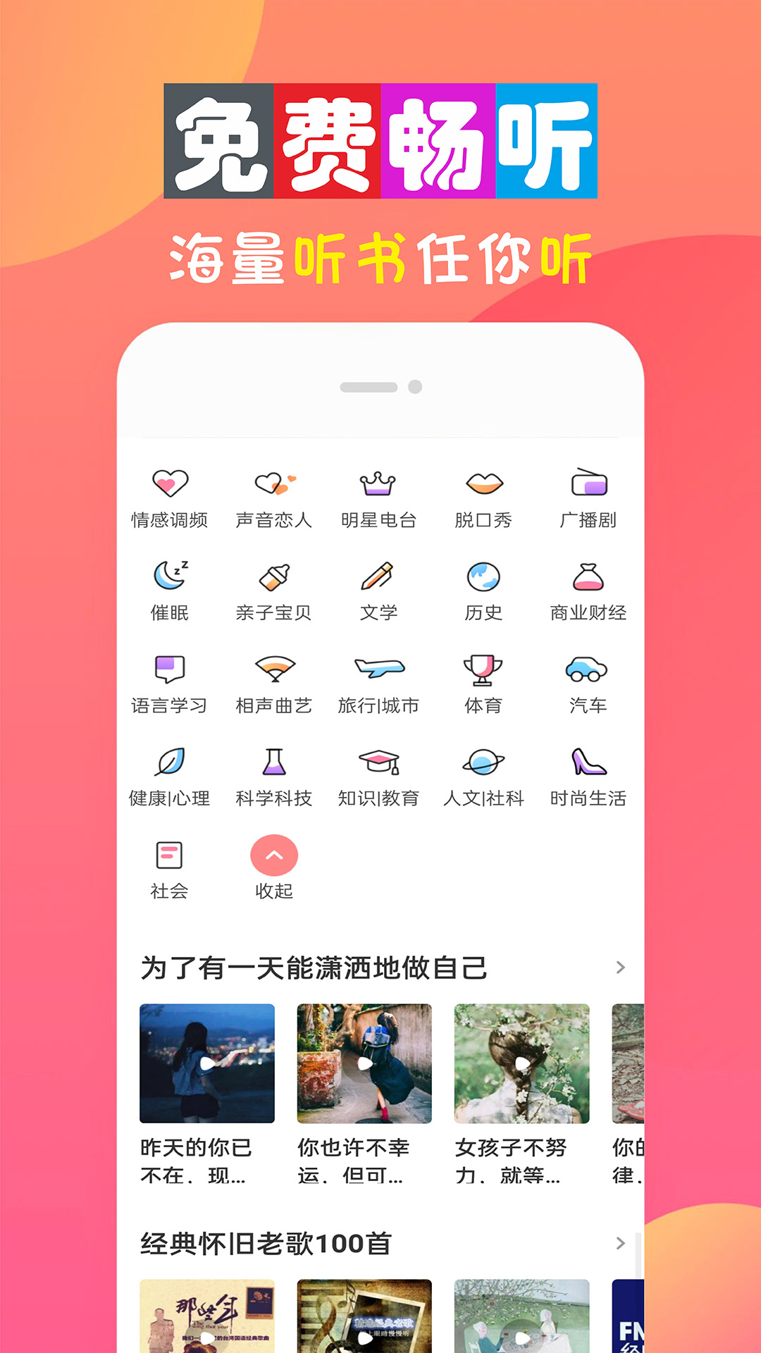 解放双眼,免费听书大全让您一心两用,驾车,地铁公交,家务,散步,旅行甚至工作,随时随地在有声的世界感受生活的美好!