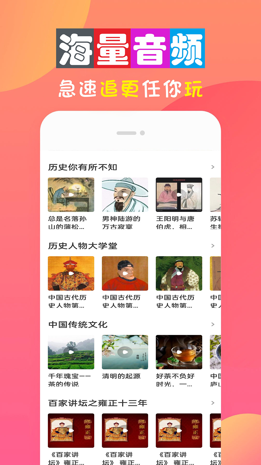 海量有声资源,畅听无极限!有声小说、百家讲坛、评书曲艺、情感、相声小品、儿歌故事、笑话段子、文学经典、亲子教育、FM电台、人文历史、旅游健康、少儿天地、商业财经...等热门分类,优质的内容呈现,懒人的听书方式,爱听什么就多听什么,让你身临其境,探索有声世界的喜马拉雅高峰!