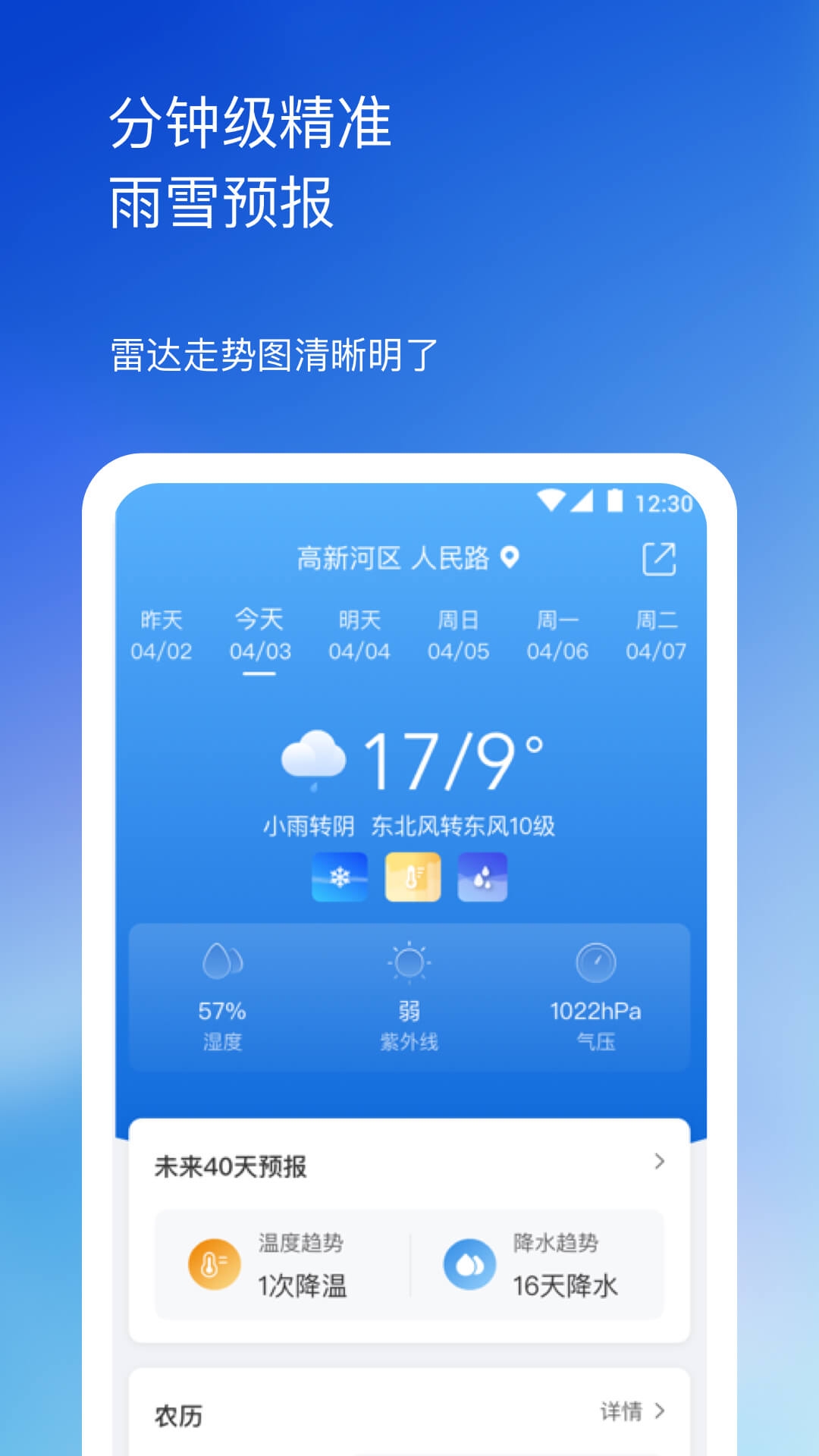 先知天气是您贴心的天气管家,为您提供多种天气预报数据,包括24小时预报、长达15日的预报、2小时降雨预报,还有天气语音播报哦。