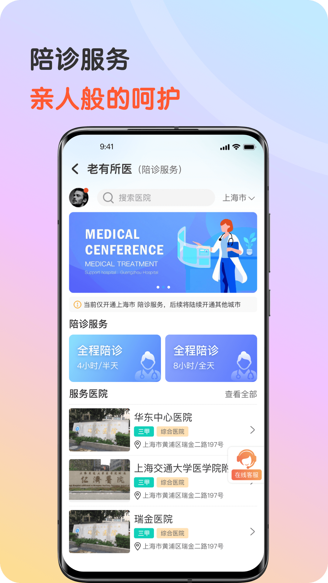 打造中老年朋友值得信赖的陪诊助老平台,以标准化的服务流程,全医护背景的专业人员,满足中老年朋友看病、居家护理等需求,让老年朋友安心、舒心,家人省心、放心。