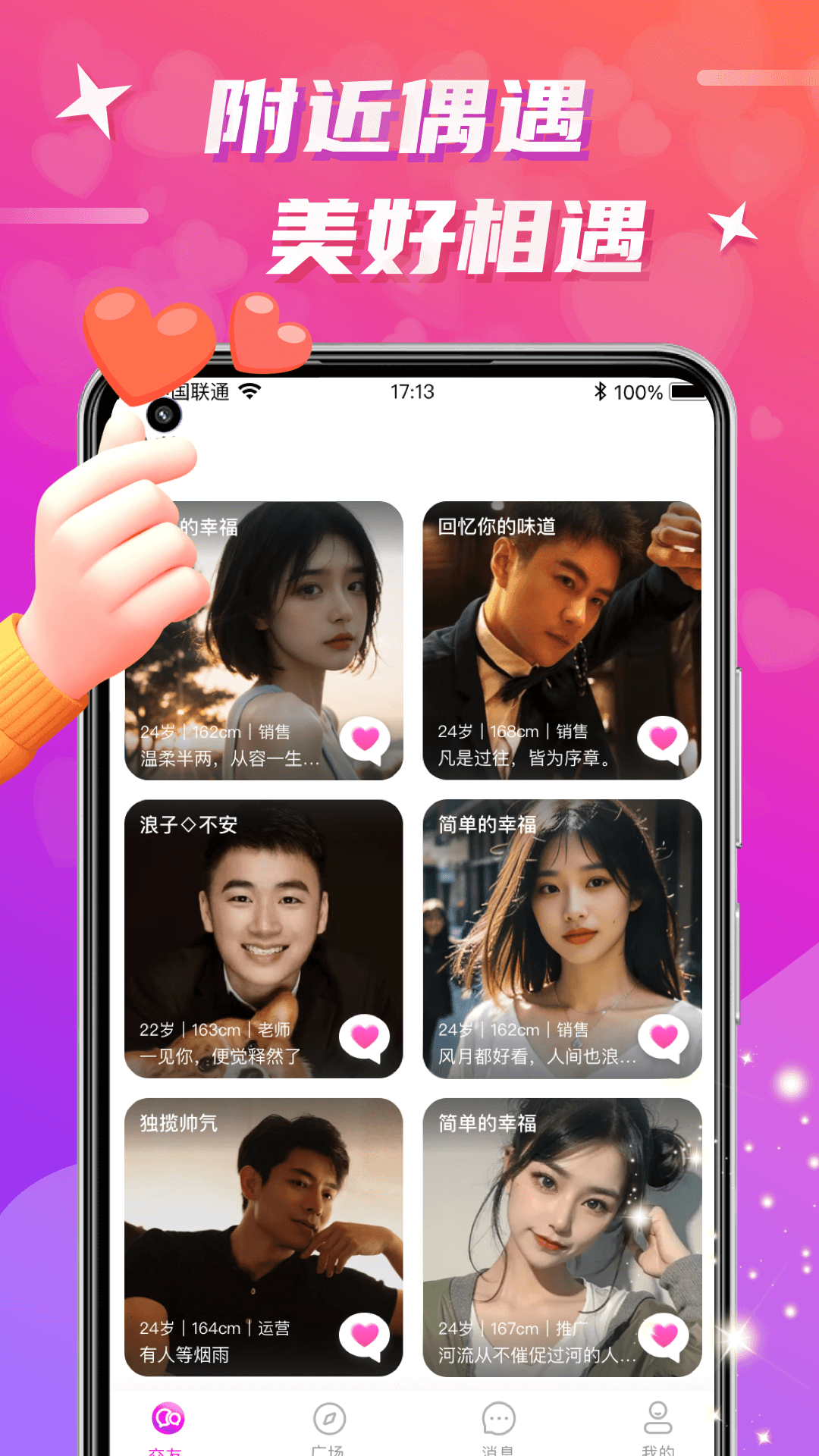 【同城附近】通过同城附近交友约会,为你的交友生活增添别样乐趣,轻松愉悦地约单,逐步告别单身生活。线上先愉快聊天、互相认识,线下就可在附近见面,在同城相伴同行。