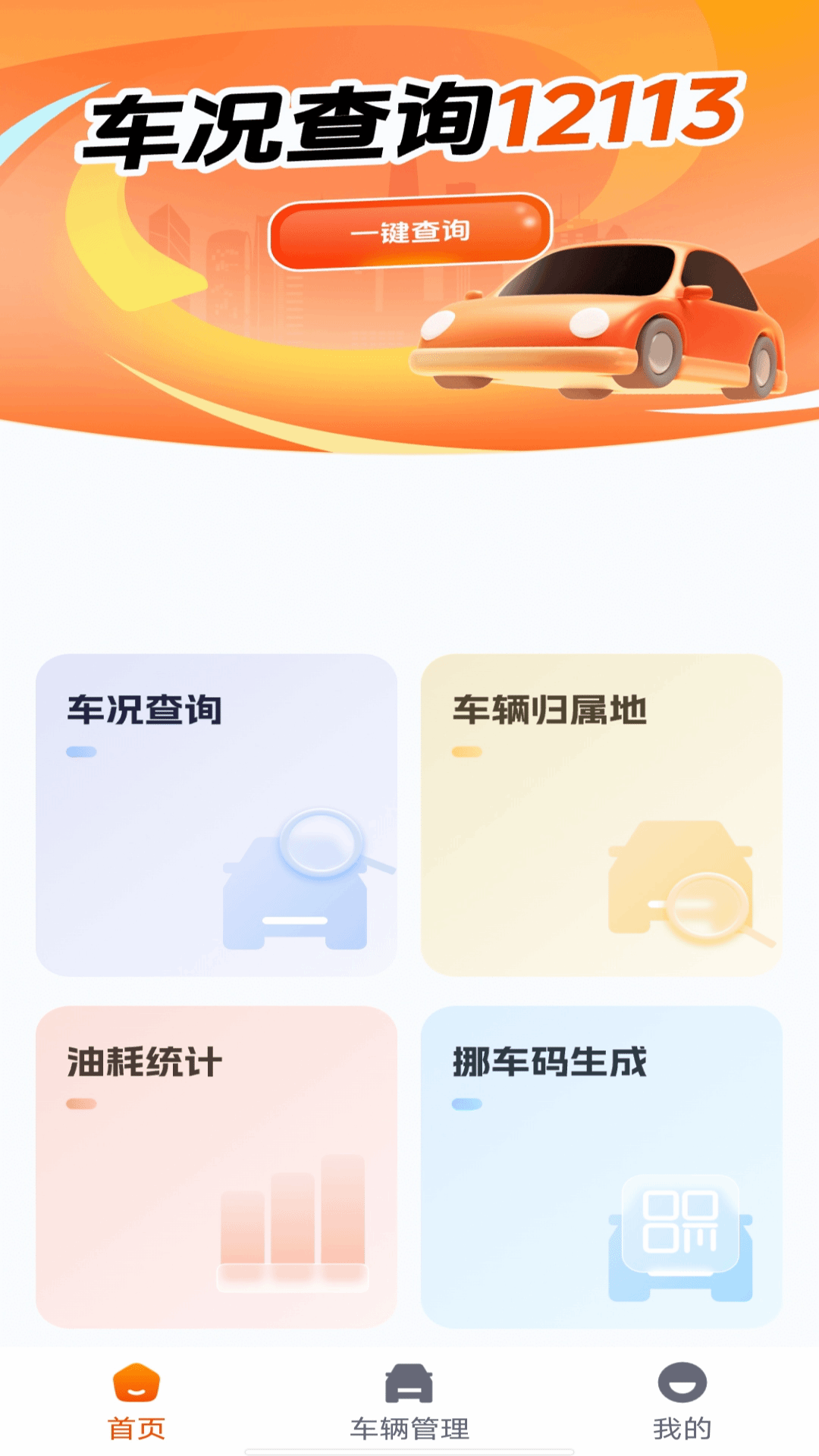 欢迎来到车况查询12113,这里是您的一站式车辆管理专属平台!在如今这个快节奏的社会里,我们深知您渴望拥有一个值得信赖且方便快捷的工具来管理自己的爱车,而车况查询12113正是您的理想之选。它集车况查询、车辆归属地查询、油耗记录以及挪车码生成等多种功能于一身,能让您的汽车生活变得更加轻松、智能。