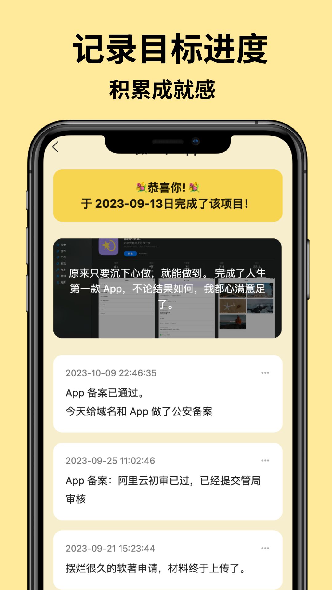 【目标进度记录】以记录进度的形式给自己增添力量,认可自己已经作出的努力。在此处,你可以见证自己进步的历程,看到为逐步靠近梦想所付出的心血。