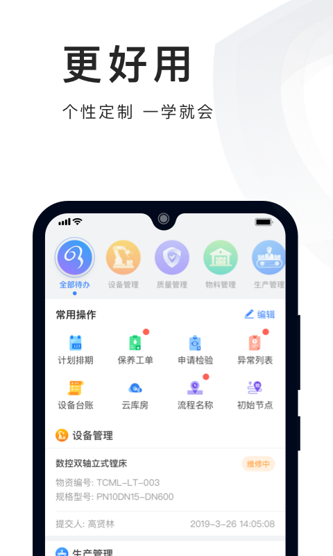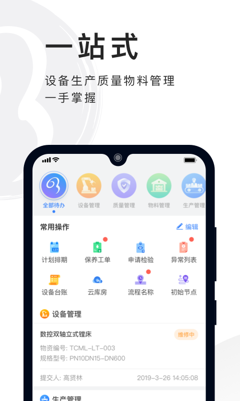 包含设备维修保养、点巡检、备件管理、计划管理、开关机管理、特种设备管理等内容。