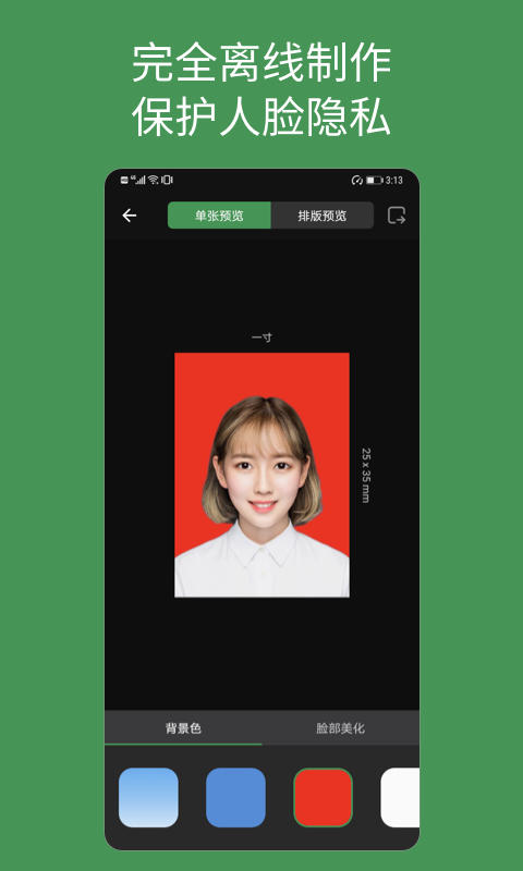 特别要提的是,所有证件照都是在您的设备上离线制作的,不会上传任何人脸数据,您的隐私可以得到很好的保护。