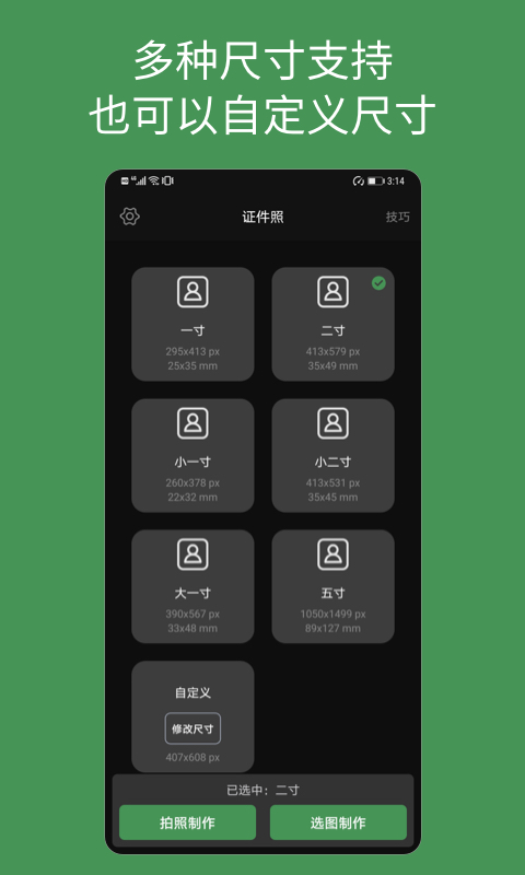 白描证件照App,能自动扣取人像来制作证件照哦。它可以制作多种尺寸的证件照,无论是常规尺寸还是您自定义的尺寸都没问题。证件照的底色也能随心更改,多种底色任您选。