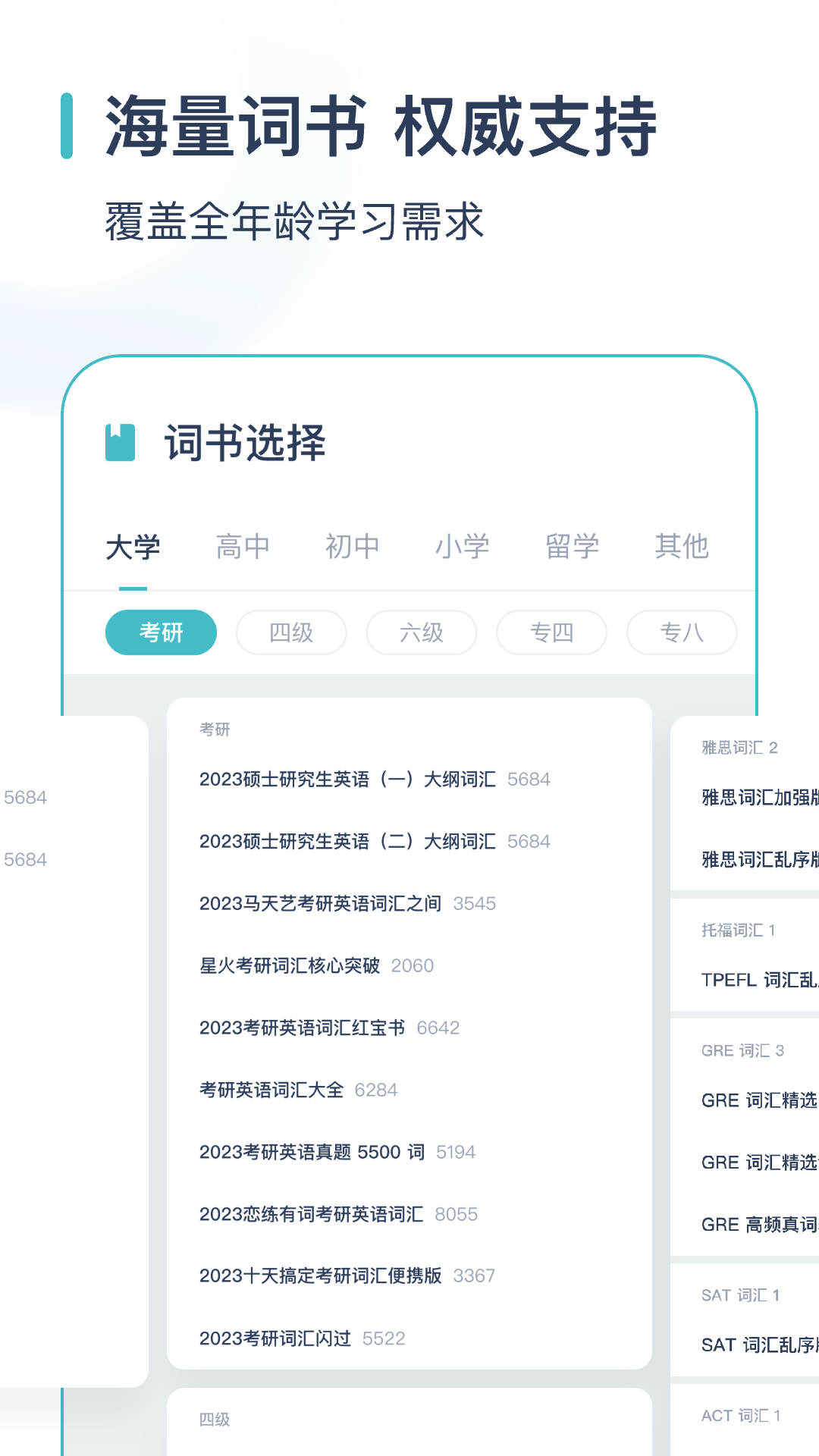 - 涵盖数百本权威词书,涉及考研、四六级、专四专八、考博、新概念、雅思、托福、GRE、GMAT、自考、专升本等众多单词学习阶段。