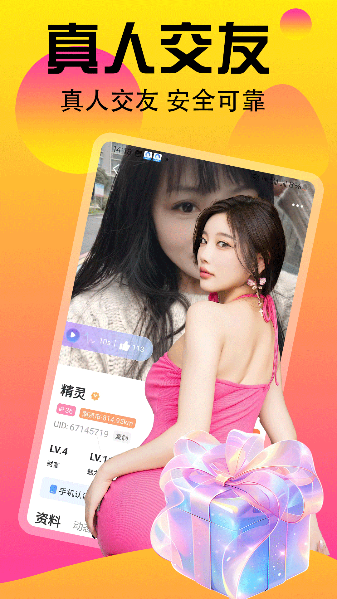 它提供高品质的真人交友服务,所有用户都经过视频认证,让你放心交友。在这里,你能体验到绝妙的同城附近陌生人交友聊天的乐趣,通过交友聊天来找寻恋爱对象,享受独特的交友恋爱体验。还有限时专属的语音视频陪聊互动,24小时在线聊天随时开启,这里的每个人都和你一样,渴望找到伴侣,慰藉孤独的心灵,附近的妹子还会主动邀你聊天哦。