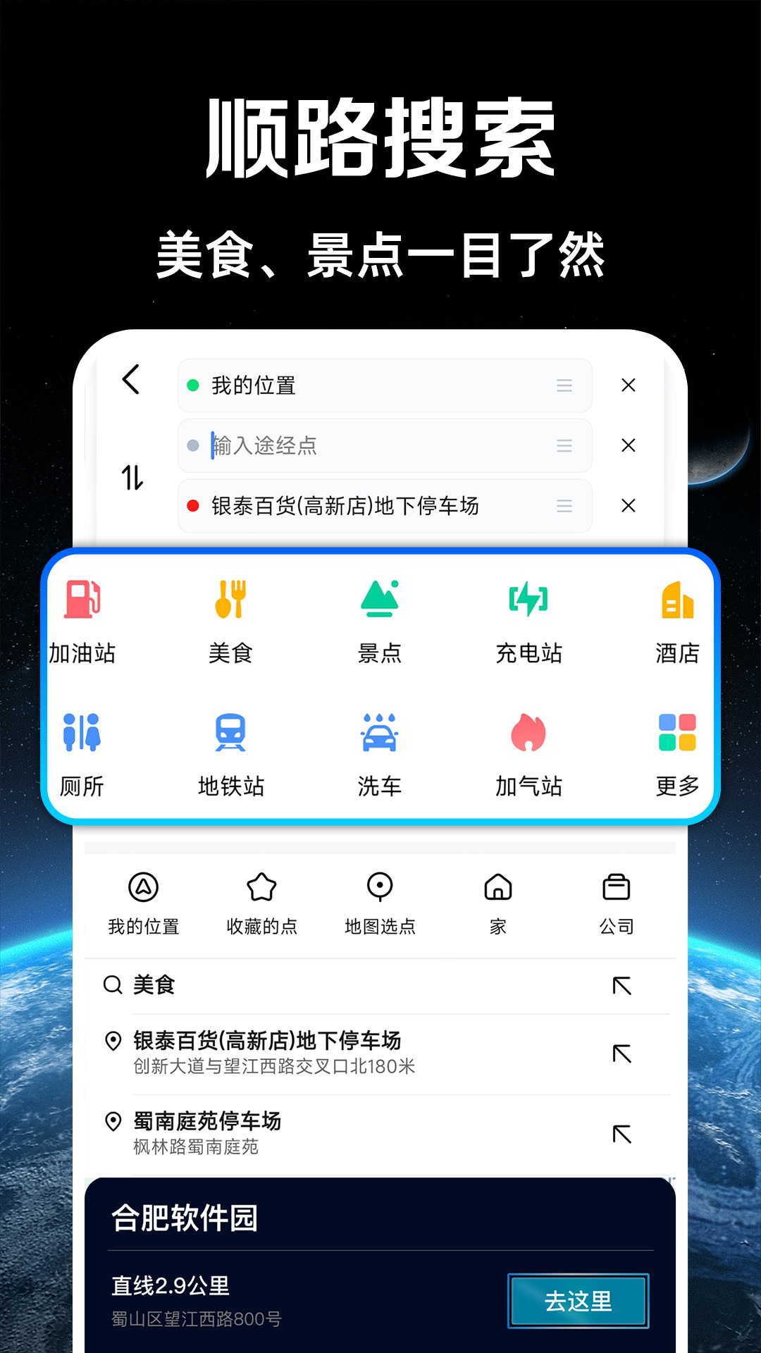 【沿途搜索】路途漫漫,一键搜索附近加油站,充电桩,厕所,酒店住宿,旅游景点等,只为给您的旅途多一份便利。