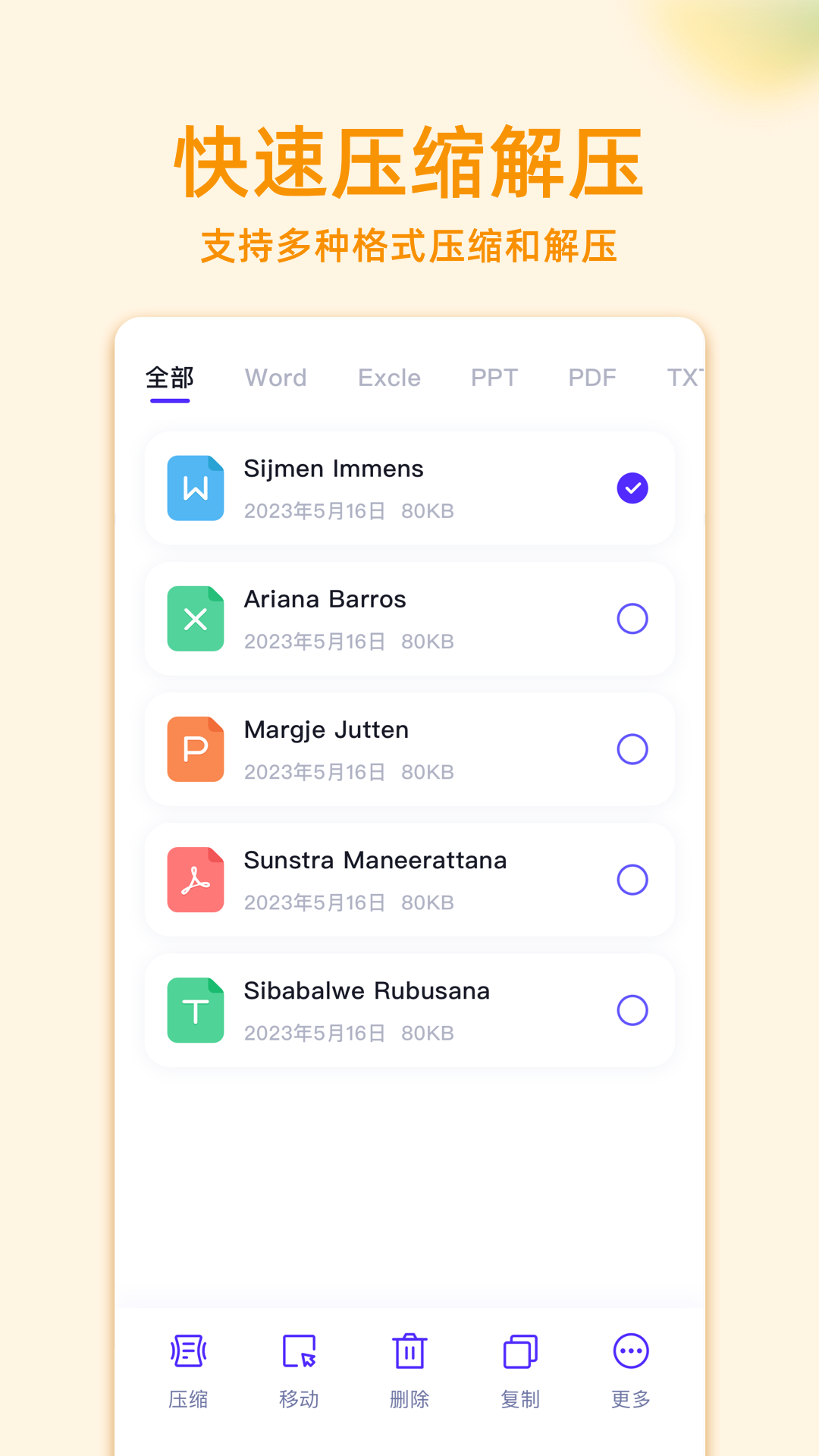 其文档压缩解压功能也十分强大,涵盖了word、excel、ppt、txt等多种类型的文档。