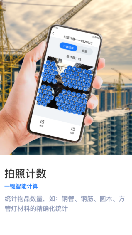在计数扫描方面:该软件能够对钢筋、钢管、木材、轮扣等众多工地常见物品进行计数扫描识别。在扫描的图片上逐一标注,然后自动计数,与传统的图像识别计数器相比,具有明显的优势。