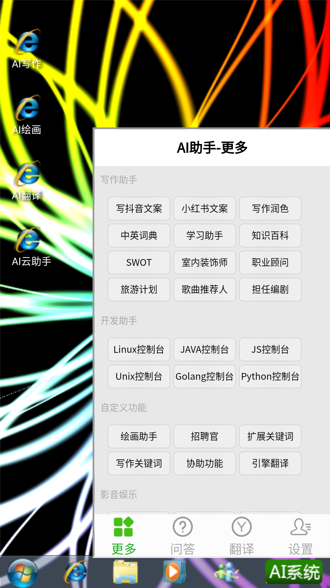 这是一个多功能的AI系统助手,能够在写作、绘图、翻译等多个方面为用户提供助力。
