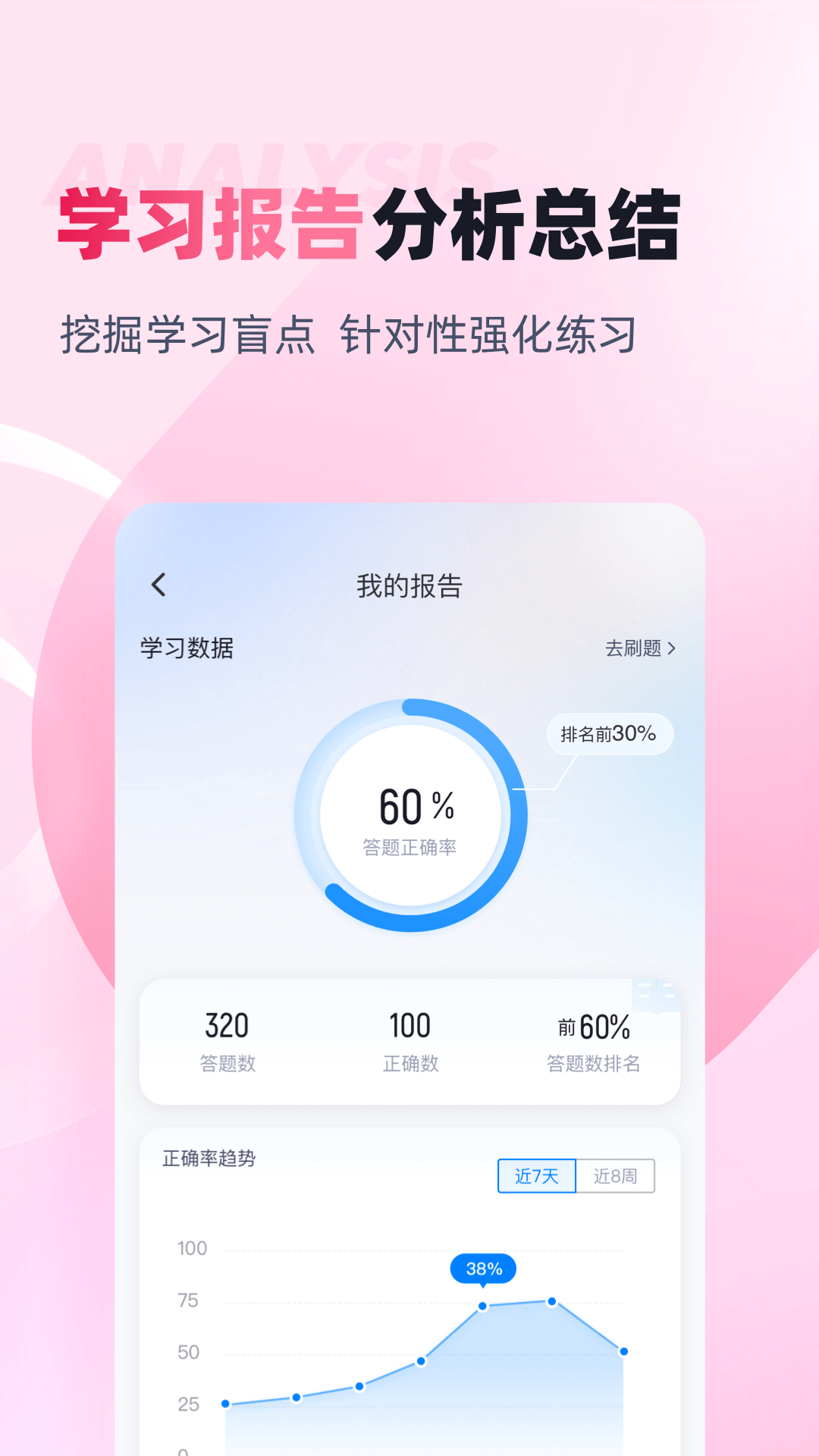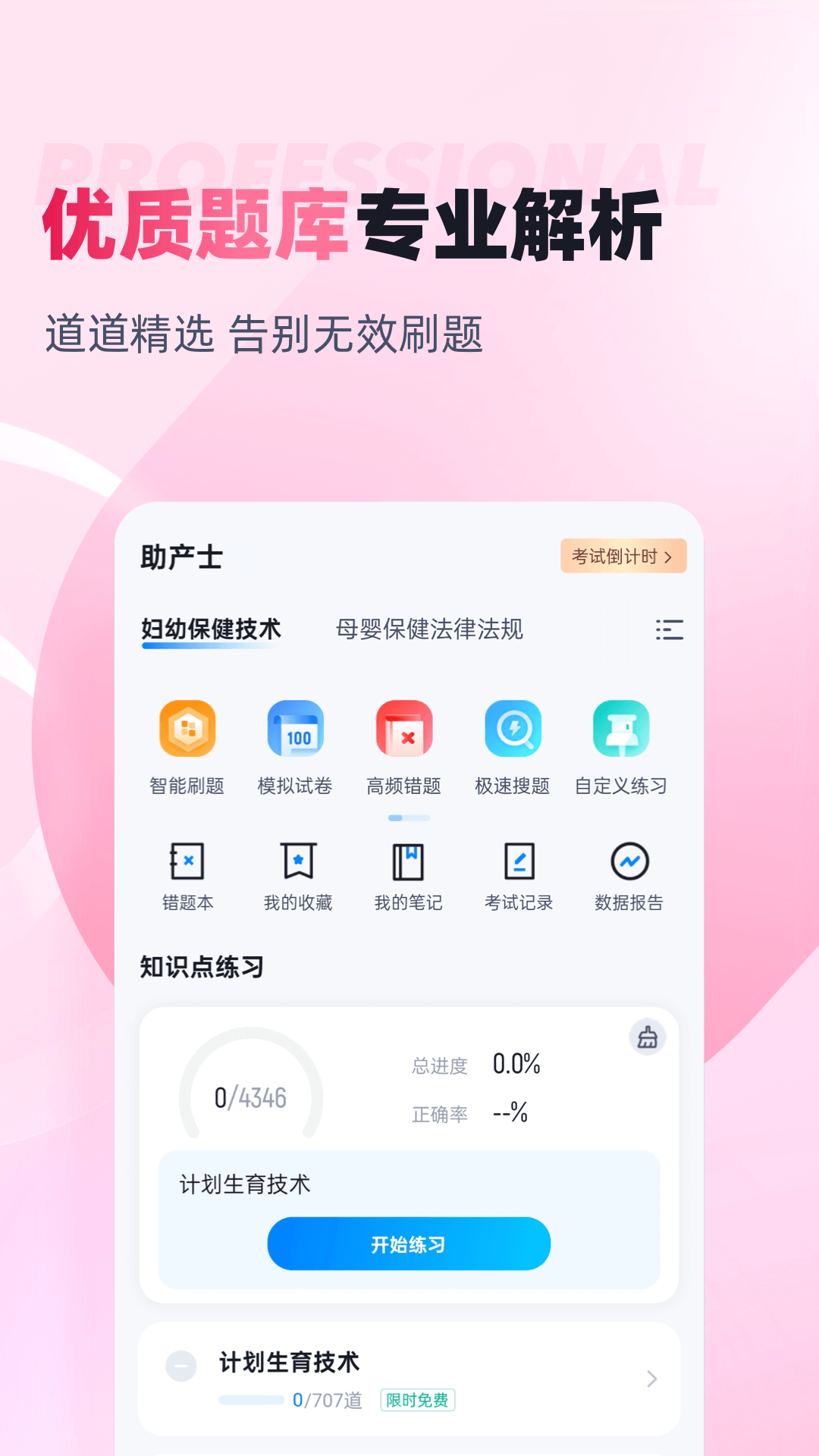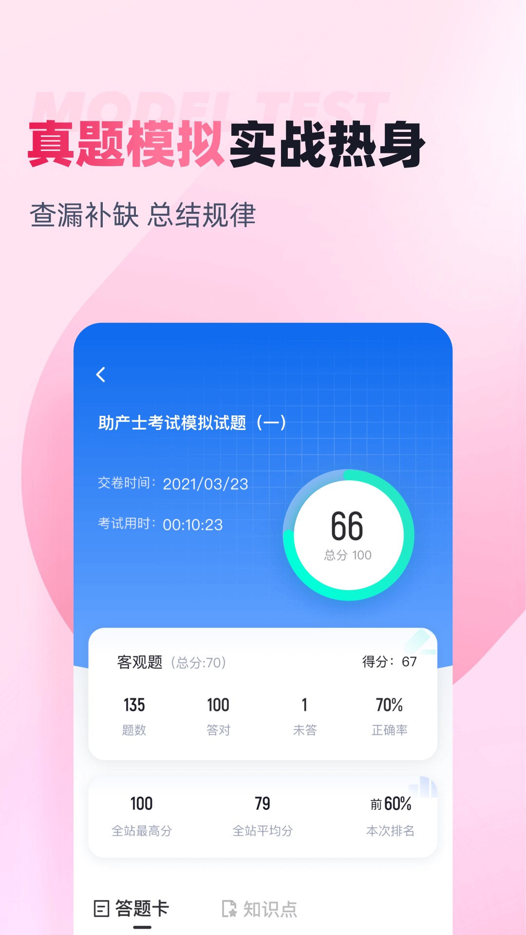 助产士题库内含考点练习,全国通用卷以及地区卷模拟练习,以及按照固定考试比重的随机式的抽题的真题考场,成绩单实时记录考试数据,一点一滴的反馈考生近期学习状态以及自我正确率的提升,大大的给予考生通过考试的信心。