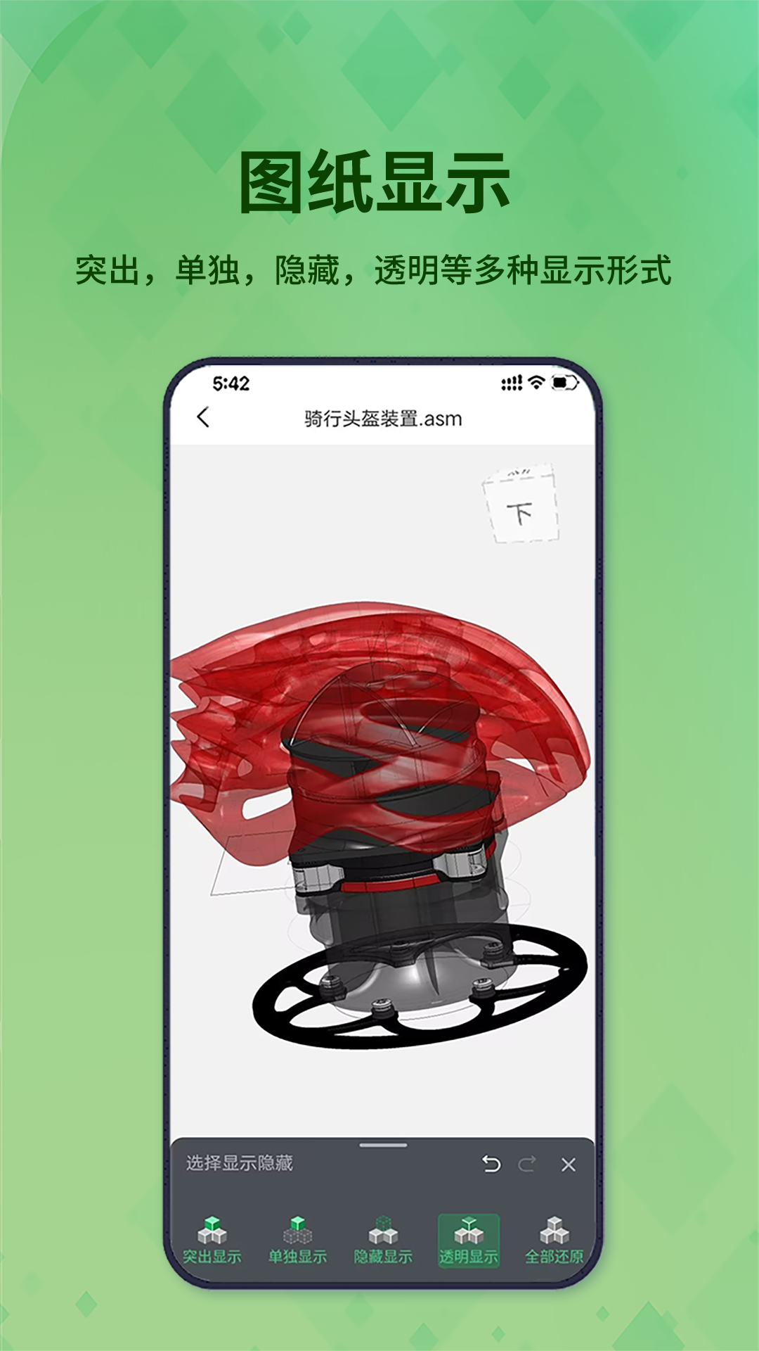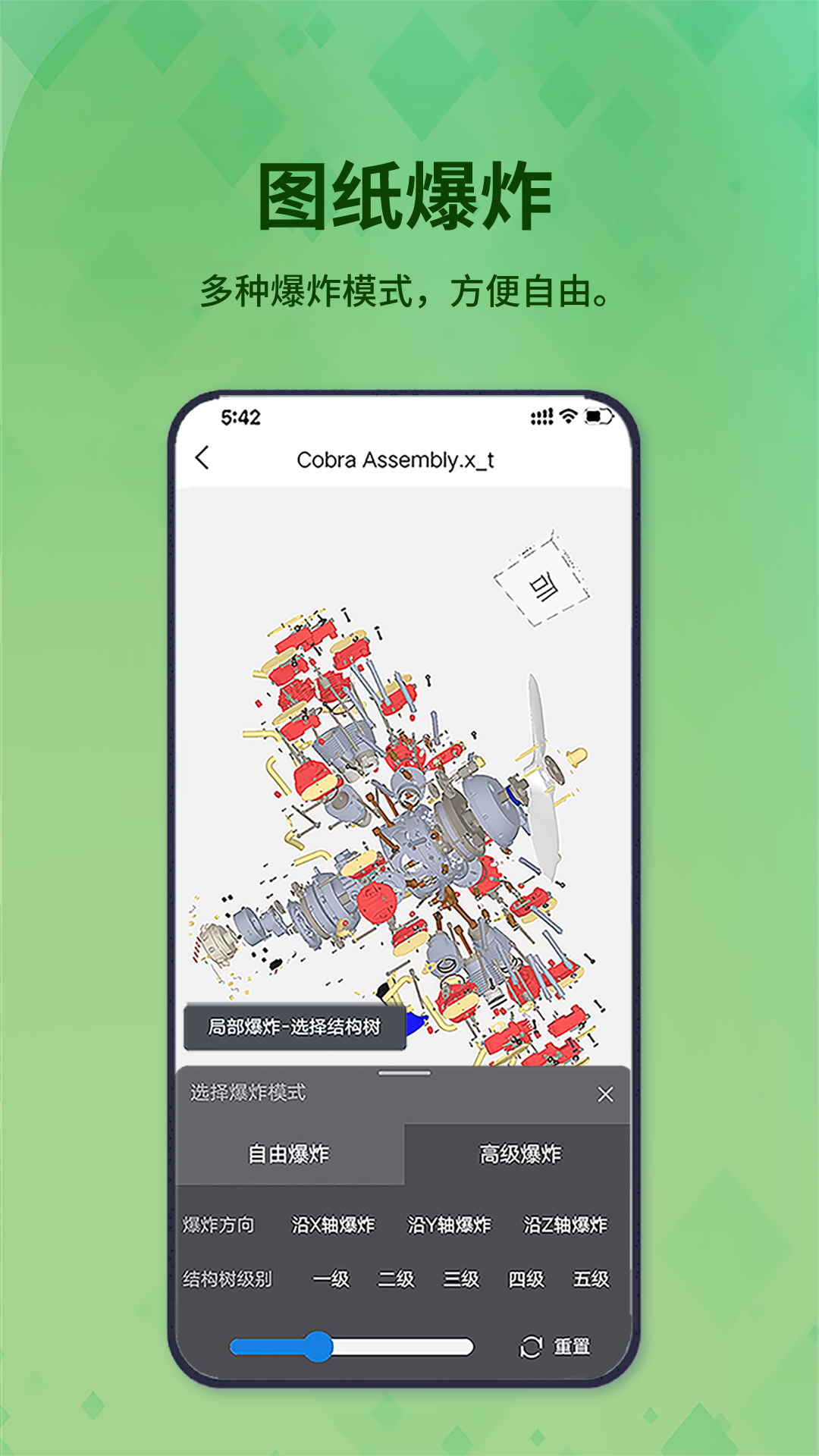 3D看图王的浏览图纸的交互功能丰富(多角度查看,缩放,平移,旋转,爆炸,测量,剖切,显示隐藏等)。同时可一键分享至各社交平台(微信,QQ)。