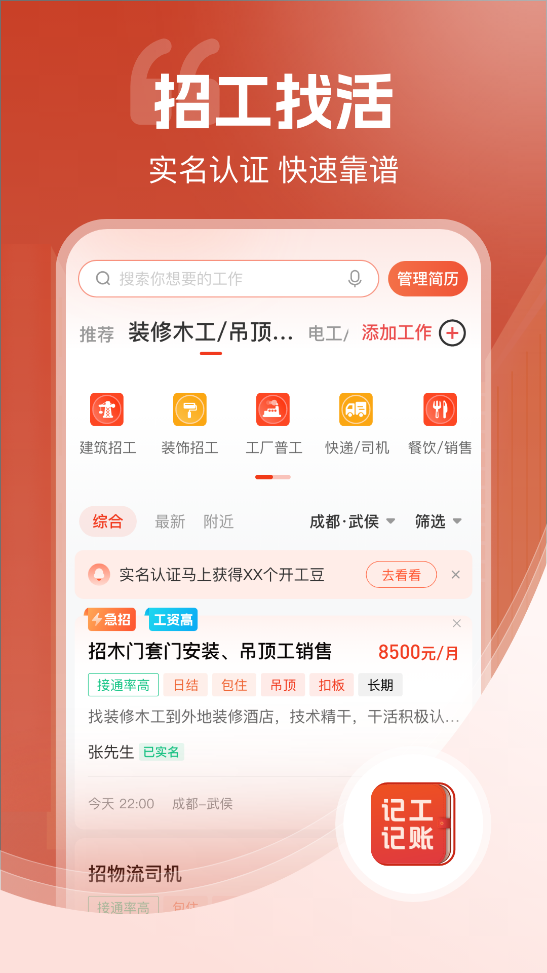 记工记账APP是成都集致生活科技有限公司针对性为建筑工友记工记账研发的智慧工地办工软件,为工友记工天、记工时、工地记账、工地记工、工地考勤提供移动办工服务;工人/班组长身份可自由切换,工友能根据自己需求选择办工,促进工地工作效率。