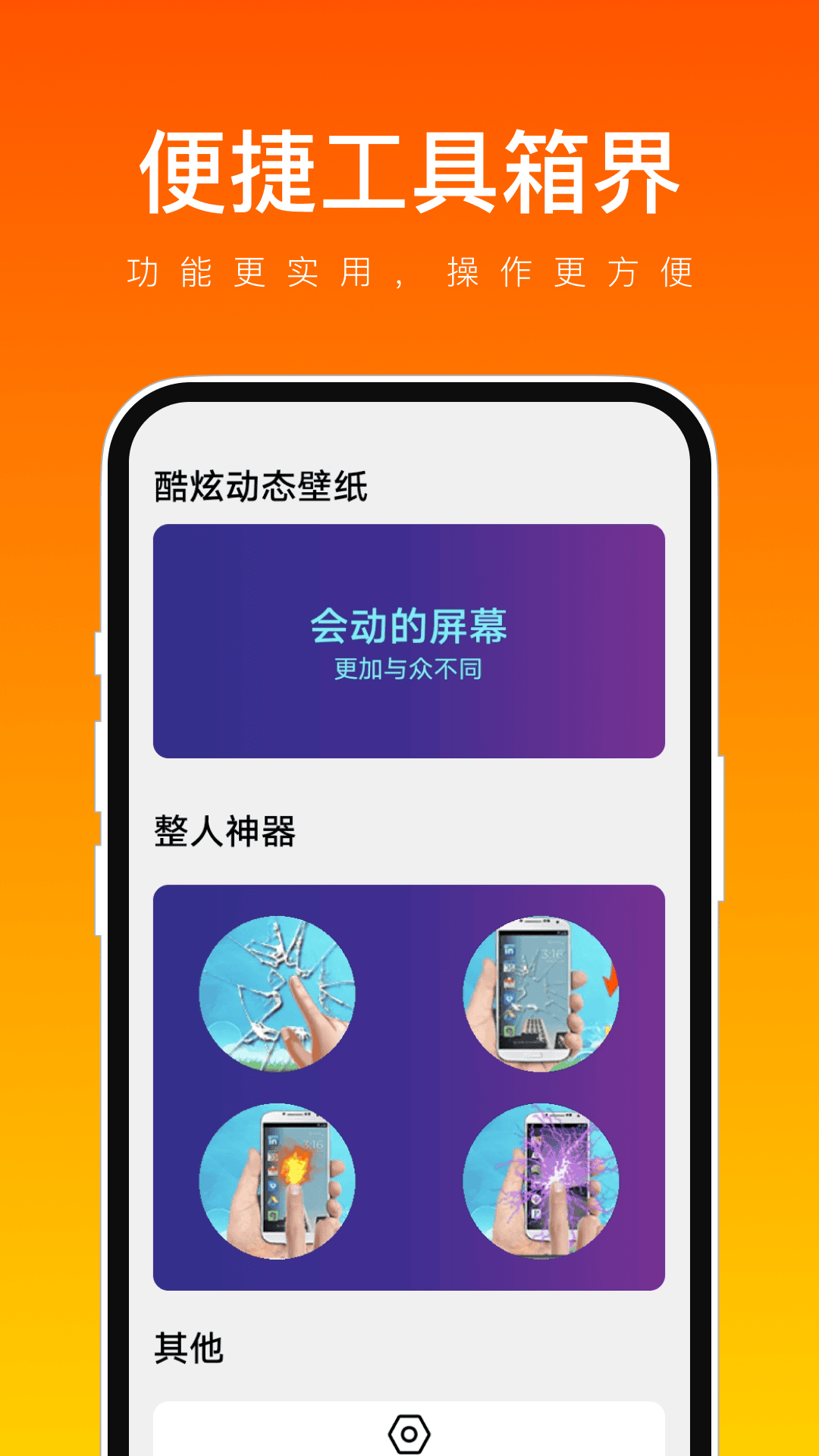 便捷工具箱界是一款集合众多实用工具的应用,包含酷炫动态壁纸,整人神器,其他等等,操作简单,即点即用,避免下载超多应用的难题,让您的手机节省更多空间。希望便捷工具箱界成为您的生活助手,赶快来试试吧~