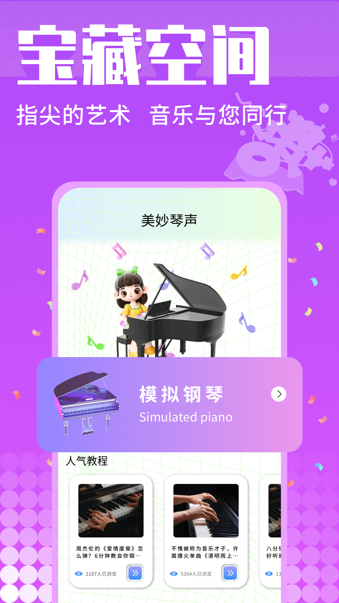 此外,畅玩空间还有模拟钢琴功能。它能将你的手机瞬间转变为一位钢琴教练,辅助你练琴、弹琴,帮助你练习钢琴节奏,了解钢琴相关知识,学会钢琴识谱。