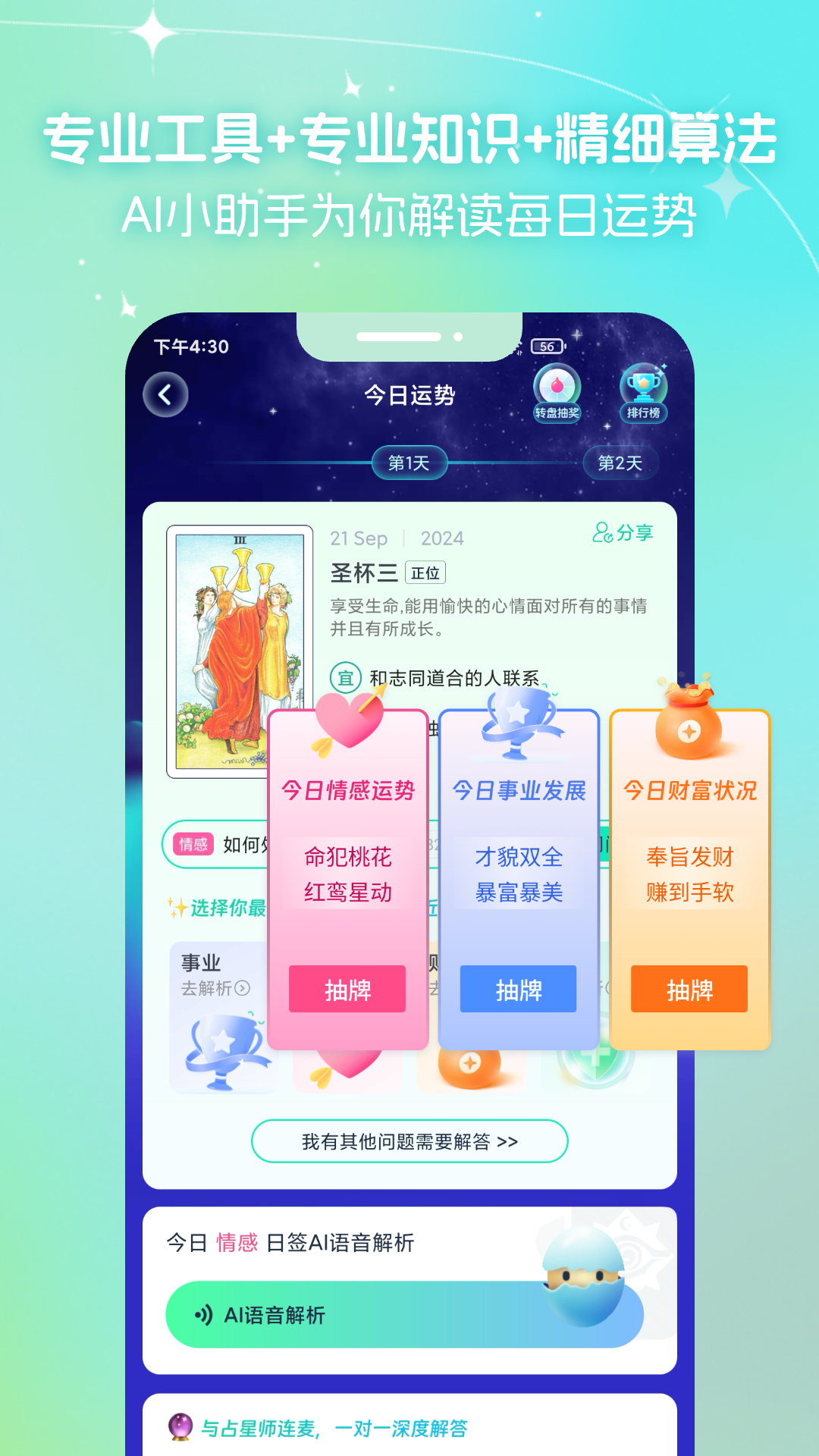 认证达人与提问用户能够实时在线通过连麦与语音交流,针对星座运势、爱情婚姻、人际关系、事业财富、工作学业等问题与牌阵测试结果进行全面解析,给你幸福指引!