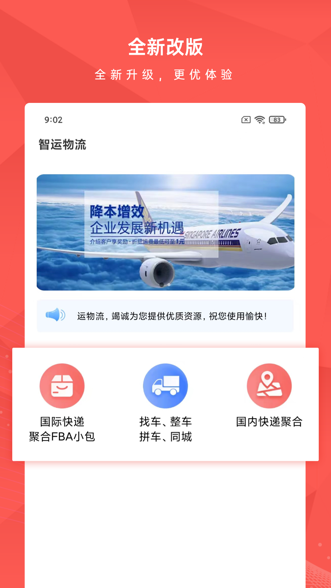 智运物流APP是一款功能强大的物流服务平台,可查询全球范围内的运输价格,提供一站式物流解决方案,无论是国际快递、物流专线、空运、海运、跨境物流、FBA业务,还是找车发货运输等问题,都能方便、快捷、高效地得到解决。
