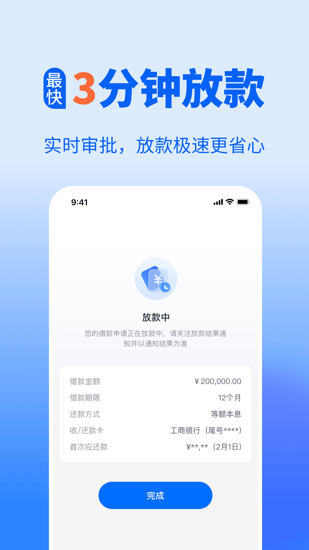 实时在线审批,审批通过放款快至3分钟