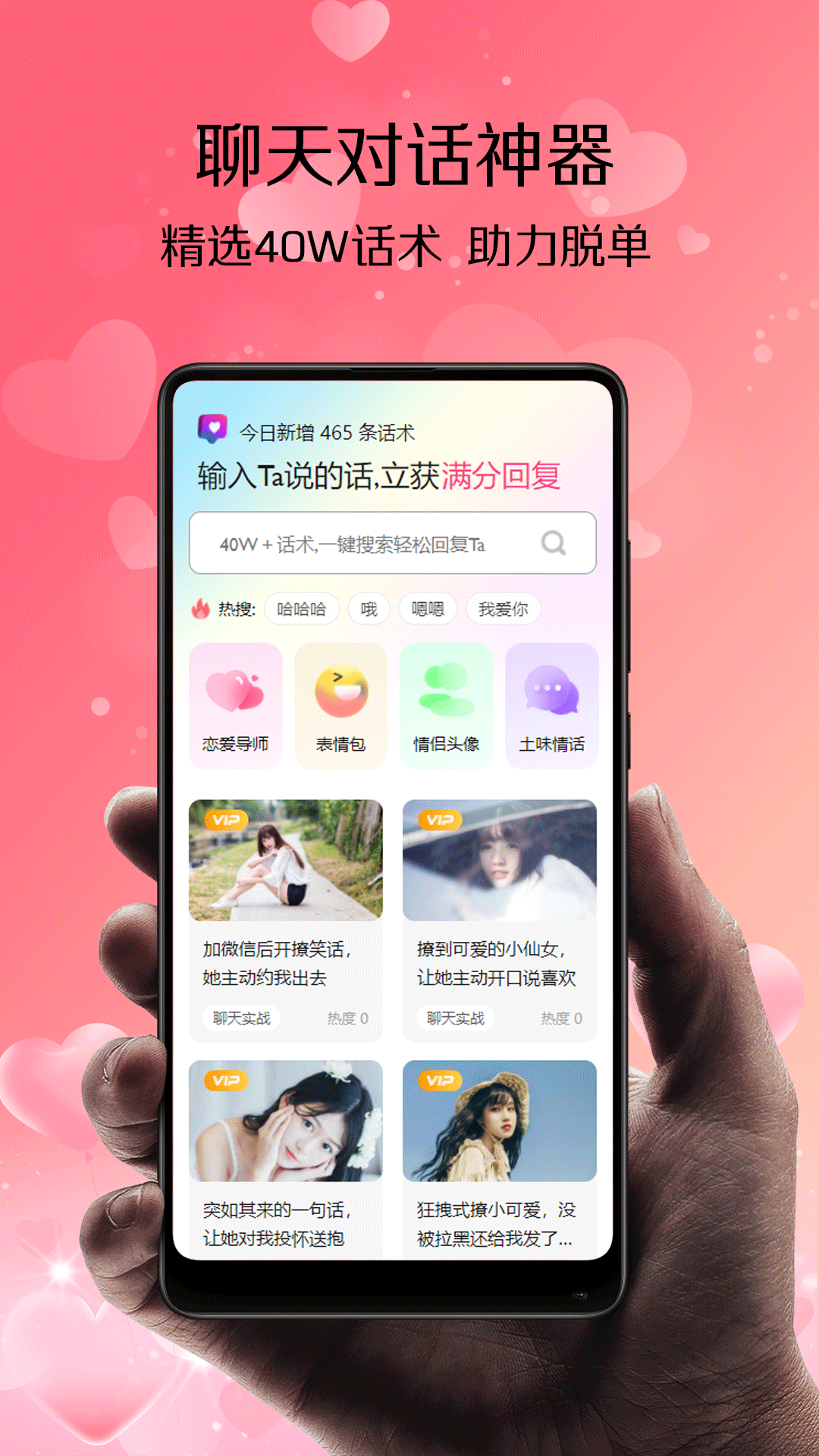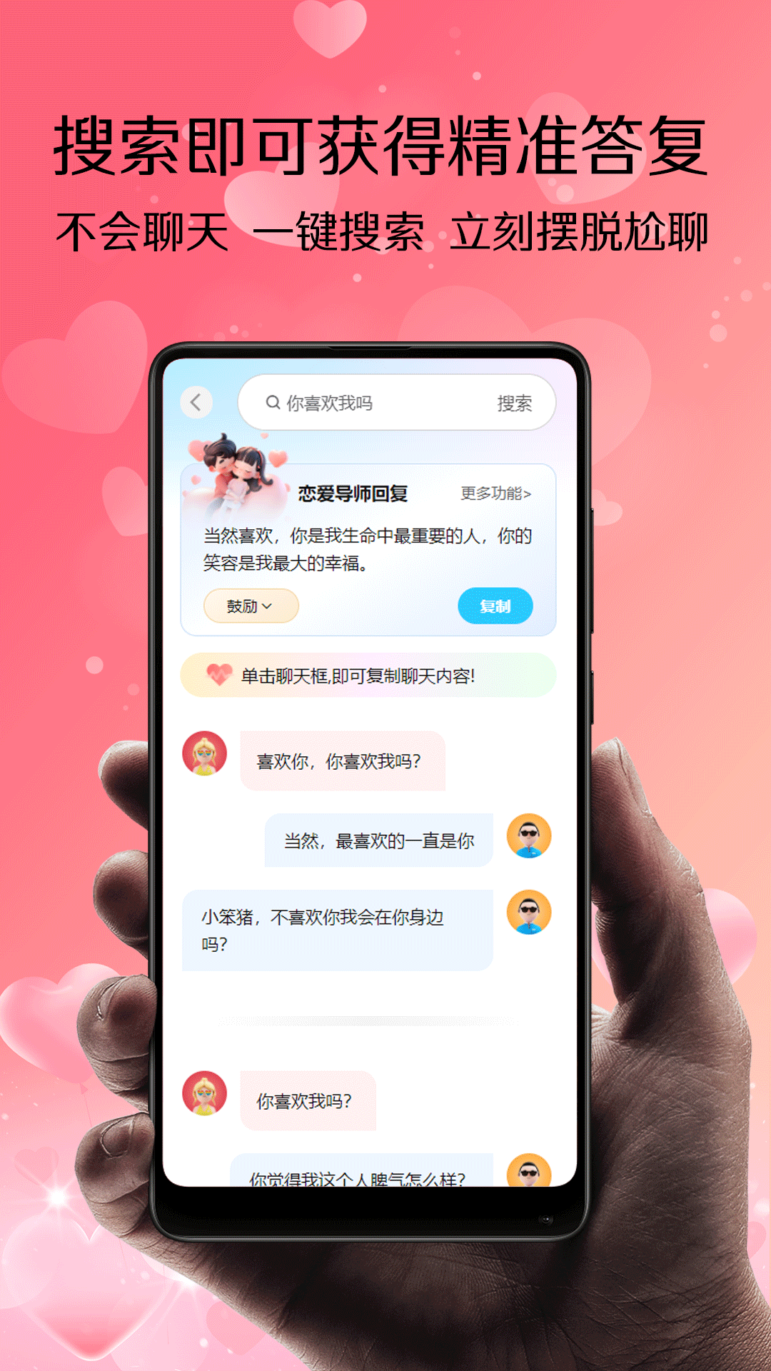 这是一款收录了40万+话术的聊天小助手。当你和别人聊天的时候,只需把对方的话复制一下,然后就能一键进行搜索,得到高情商的回复内容。而且各种聊天话题还在持续不断地更新哦。要是在追求女生或者和对象聊天时找不到话题,又或者遇到不懂怎么回应的情况,只要搜一搜,就可以复制高情商的回答。它就像一个全智能的恋爱导师,手把手教你追求心仪的TA,让你迅速脱单,开启甜蜜的恋爱之旅!
