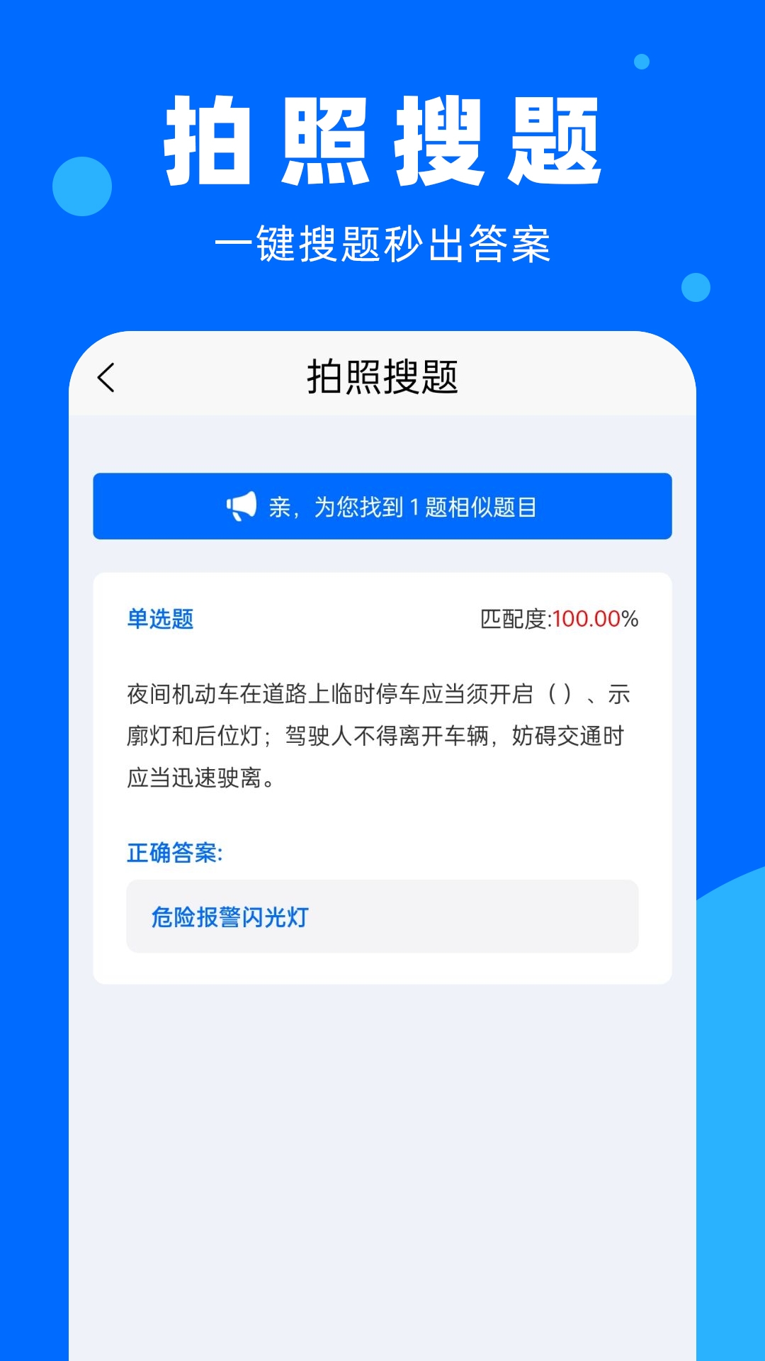 仅需轻松一拍,驾考题目答案马上就会出现,并且能保证百分之百的正确率,使驾驶员即便在忙碌的生活里也可以高效学习,简单地掌握驾考知识。