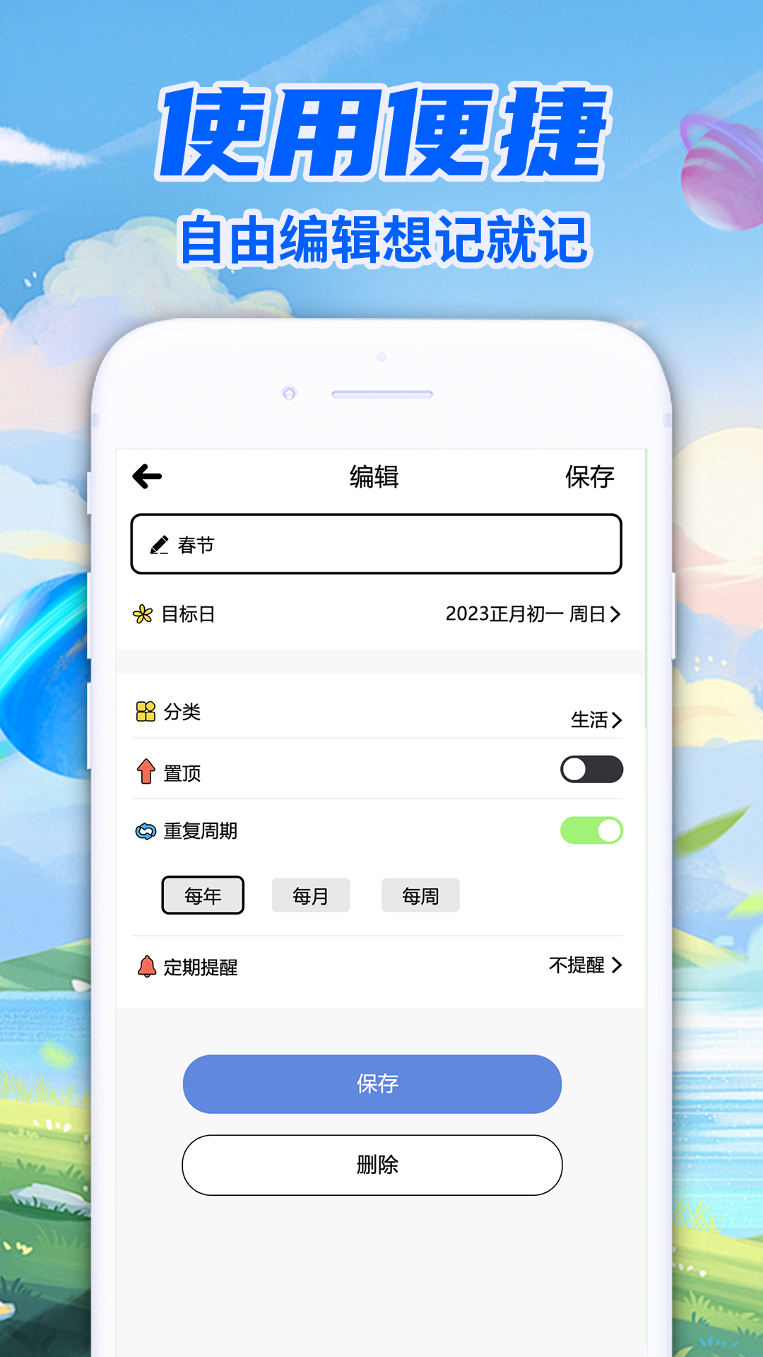 1、自定分类:如工作、生活、节日、纪念日等