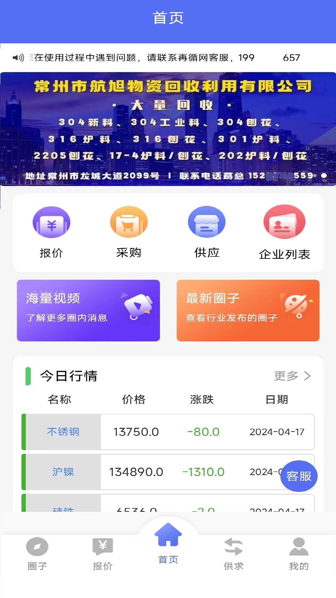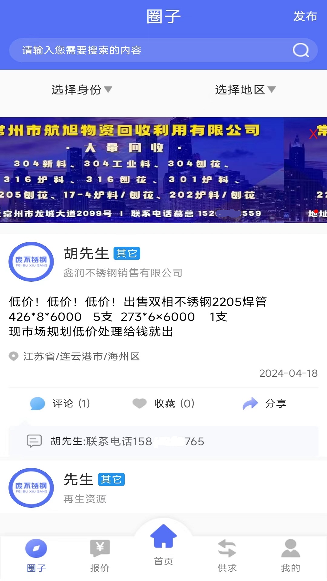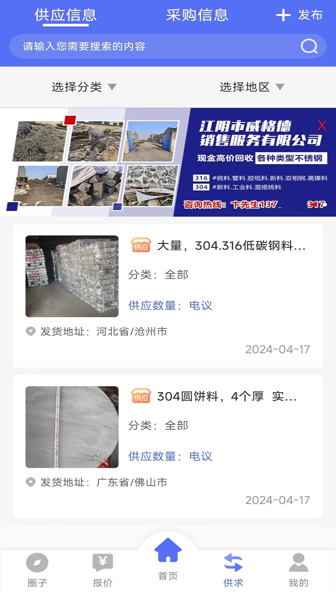 此外,平台还为废不锈钢行业的人员打造了交流圈子,这个圈子就如同微信朋友圈一样便捷。用户可以在其中发布个人以及公司的需求。在圈子的供求信息上方,专门设有广告位,用户能够通过这个广告位来推广个人及公司的信息介绍。