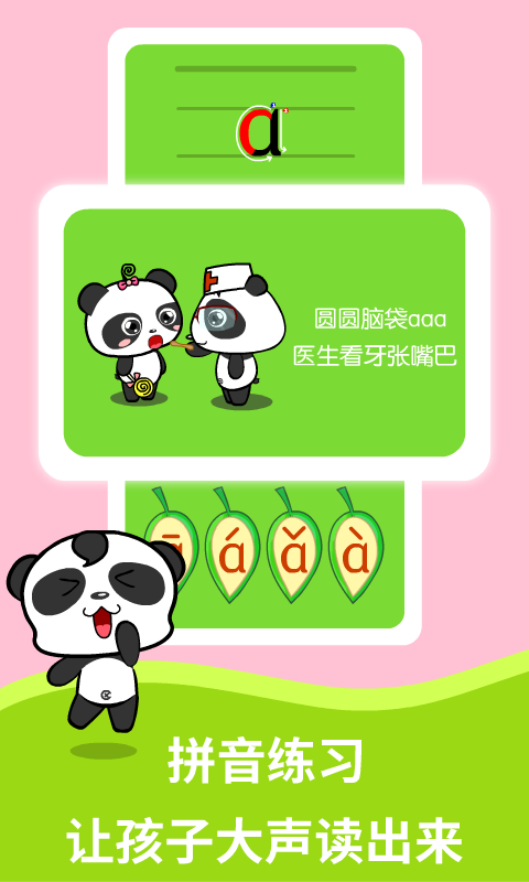 熊猫拼音是由“熊猫乐园”专为小朋友精心打造的互动式儿童学拼音软件。该软件以小朋友喜爱卡通动画游戏这一兴趣点为切入方向,引领孩子走进神秘又刺激的拼音寻宝天地,让孩子在观看动画、玩游戏这种充满互动性的过程里,潜移默化地学会拼音。在整个拼音学习寻宝之旅中,还融入了过关、闯阵、挑战等多达30多组的益智探险游戏呢。