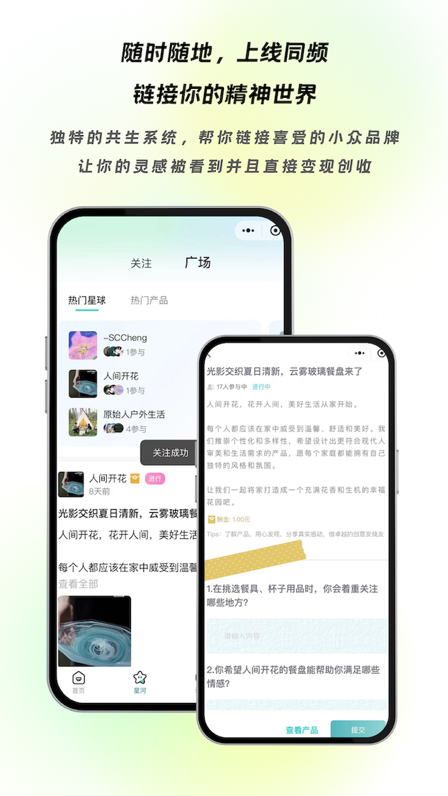 - 与品牌方和粉丝用户共同创造产品,分享真实的产品想法与使用体验,同时享受商业回报;