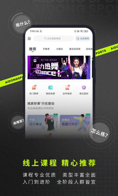 【爱动的解决方案:爱动会根据不同的训练目标,只提供更有效的可跟练课程,您选课无需成本,还能提高训练效率!】
