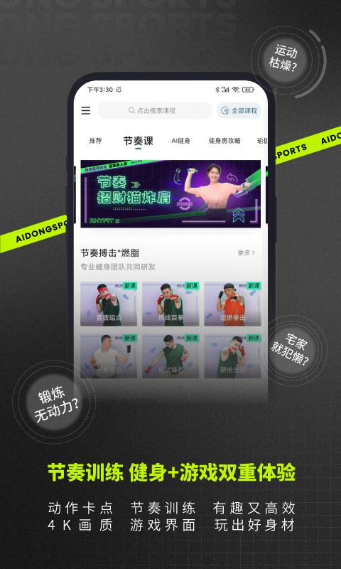 爱动健身能适应家庭、场馆等多种场景,课程种类丰富,涵盖了针对不同训练目标的所有课程。这里的每一节课程都是由爱动专业教研团队精心设计制作的,更加契合亚洲人的运动特点。