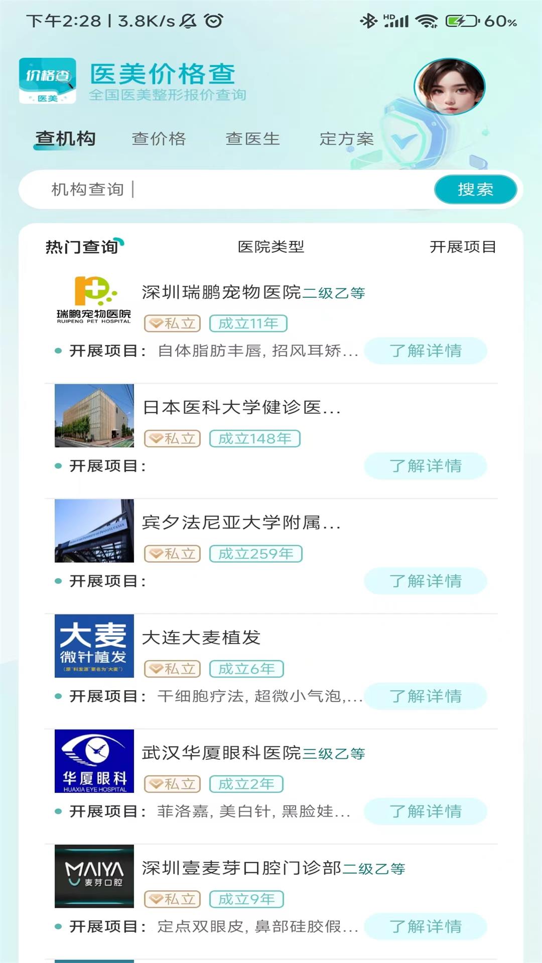 整形查全新上线! 【医美整形价格查询】免费的整形报价器还不会用?上整形查APP,不限查询次数! 【医院医生名单查询】想整形,选医院太难?一键免费查询医院白名单,拒绝吃亏! 【医院医生资质查询】别再被整形医院坑了,整前查询医院资质,整形不走冤枉路! 【医美仪器验真查询】做了热超声炮没效果?用真伪查询功能查一下,可能做到假的了! 【医美项目优惠查询】输入项目和城市,即可查询当地整形医院的优惠信息,提前了解价格 【整形原生案例查询】整形案例太假,找不到真实案例?上医美查看她们的整形全流程案例! 【整形方案定制查询】双眼皮做全切还是埋线?症状不同,适合的手术方式不同!
