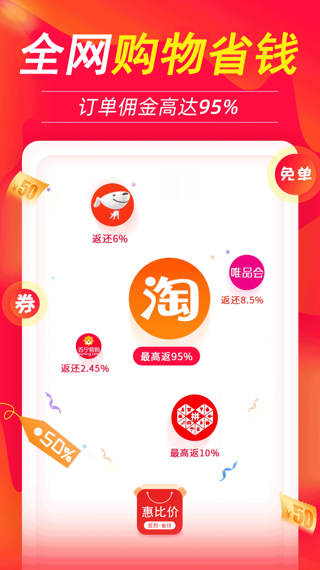 惠比价是一款全民适用的购物返利App,它能让用户在购物时节省开支,还能通过推广赚取佣金。