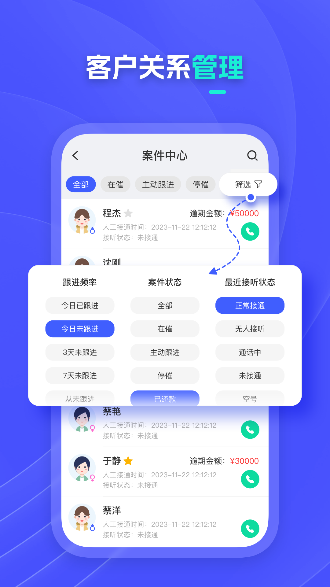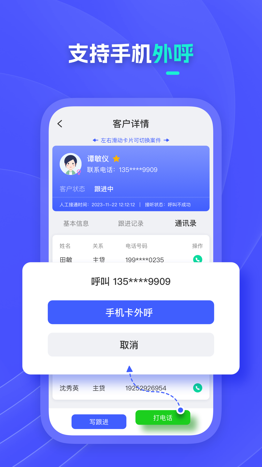 AI全链路赋能获客成交营销路径,为用户提供精准高效的客户关系管理工具。概念精简,只关心用户关心的内容分级、记录、提醒,简单行动轻松获客。多模块赋能销售链路,智能外呼、意向客户智能推送,随时进行高效线索筛选,创建任务、完成任务,不只是销售助理,更是个人助理。