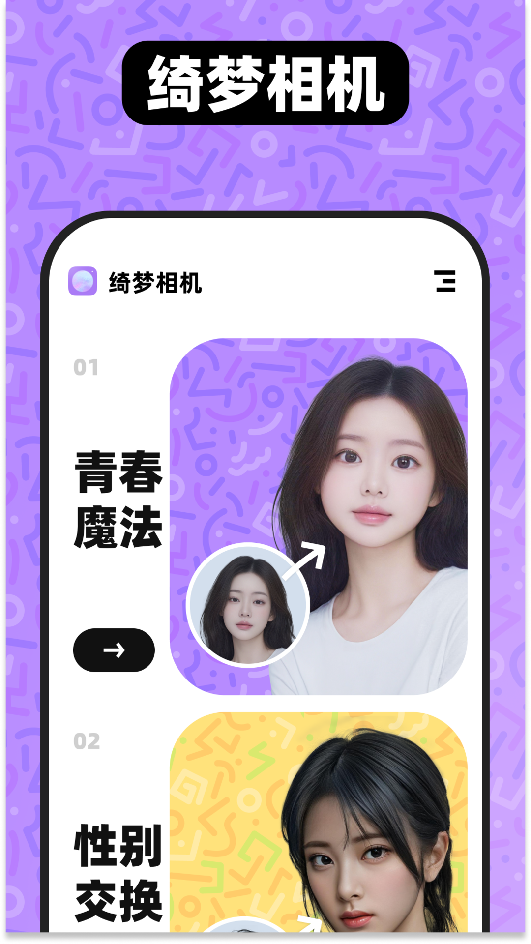 绮梦相机是一款有着梦幻图片美化效果的相机软件,拥有青春魔法和性别交换两大功能,快来下载体验吧~