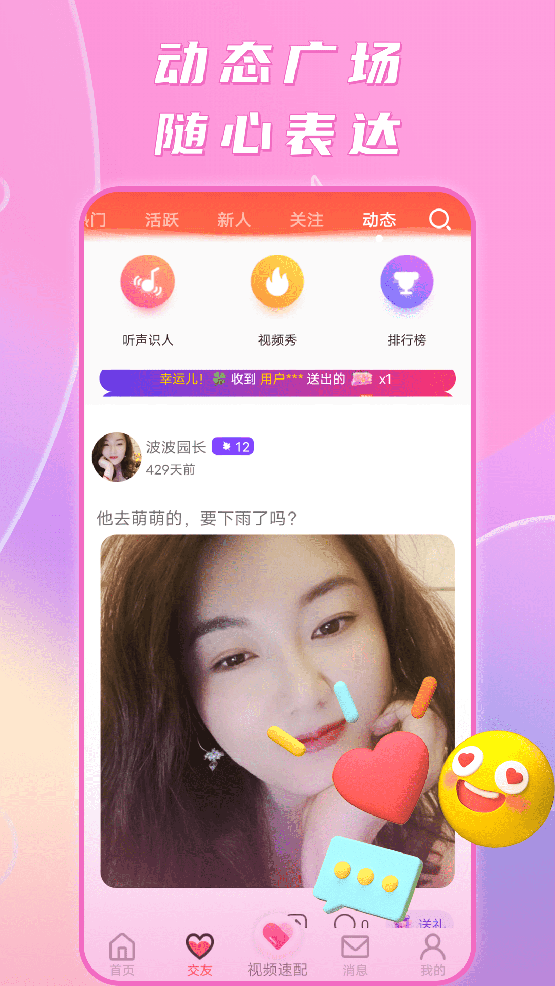 在这里,全天24小时都可以和真实的用户畅快聊天哦。无论是用文字倾诉内心的想法,还是借助表情传达细腻的情感,都无比顺畅。您可以尽情吐露心声,大胆地向心仪的Ta表达爱慕之情。在这个平台上,有趣的灵魂将不再难觅,您能够轻松邂逅有缘人,从此告别单调无趣的单身生活。