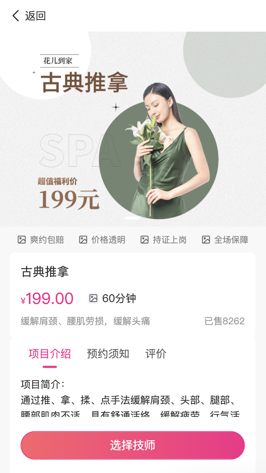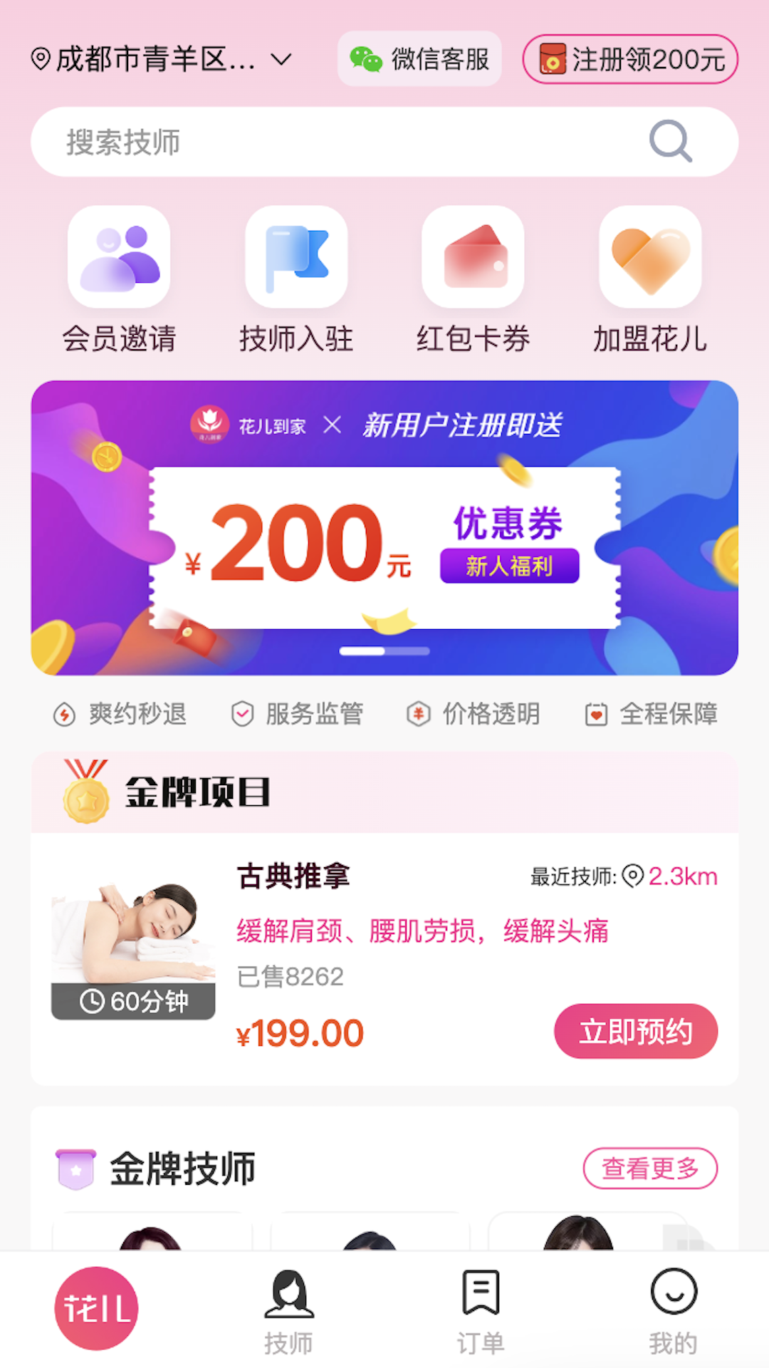 花儿到家致力于为用户预约心仪技师,为用户提供上门按摩优惠,为用户提供交易保障。平台以客户为中心,连接本地优质商户,连接本地技师,为用户提供高品质的按摩服务体验。可随时随地预约技师上门服务。