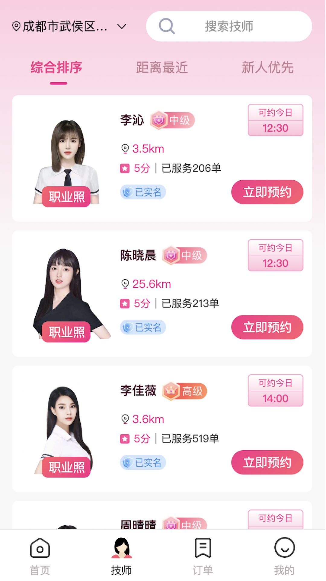 3、技师:根据地图和定位,快读找到距离近、上门快的技师,有地图模式展示和列表模式展示