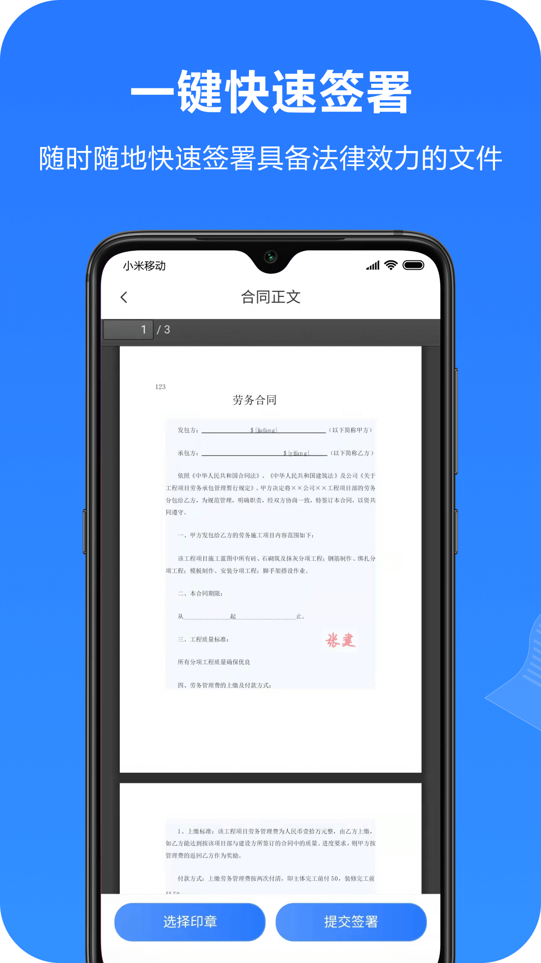 2. 合法有效的PDF文档电子签章:电子签章分为关键字签章和定位拖动签章两种类型,具有法律效力。用户在PC端上传文档并指定签方之后,就能通过手机实现在线文档的签署流程。