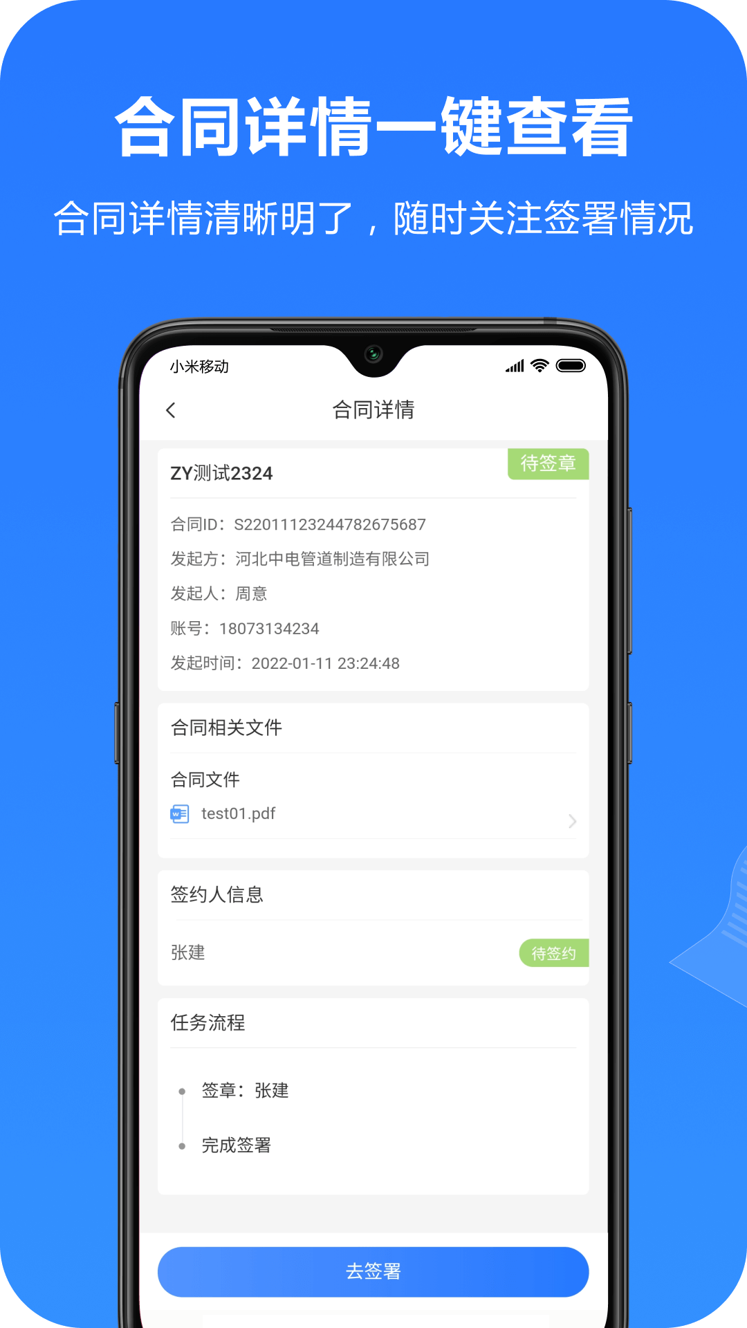 3. 多方合同会签支持:可全程跟踪合同签署过程。在多方进行合同会签时,能在PC端对文档进行查询,登录相关账号则可查看文档流程的详细信息。
