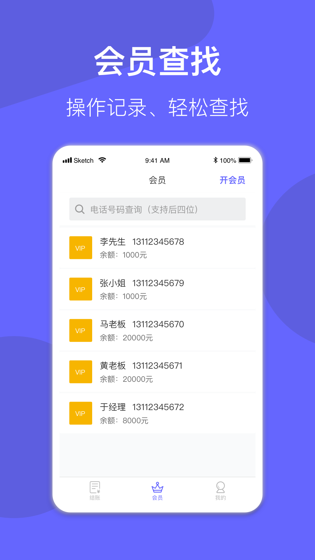 主要功能包括:会员办卡,充值,消费记账,收入对账,经营统计,数据备份等。